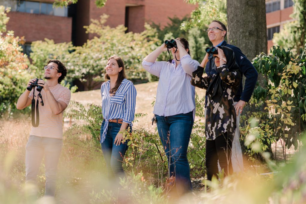 Kevin Omland, rear, goes birdwatching near UMBC’s Library Pond with some of his students. Left to right: Jon Sikora ’20, Ph.D. student Janine Antalffy, Ph.D. student Evangeline Rose, and Aiman Raza ’22.