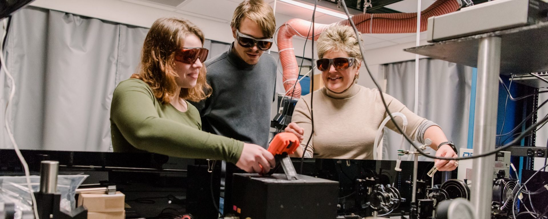 Banner image: Lisa Kelly, right, Ryan Grant, center, and Gabriella Pozza work with the laser setup in Kelly’s lab. All photos by Marlayna Demond ’11 for UMBC.