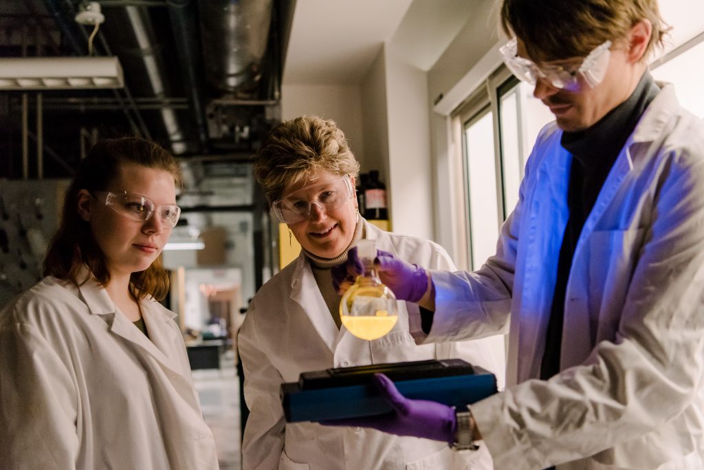 Gabrielle Pozza ’20, chemistry, Lisa Kelly, and Ph.D. student Ryan Grant examine a fluorescent dye used in their research to determine the properties of compounds they work with.