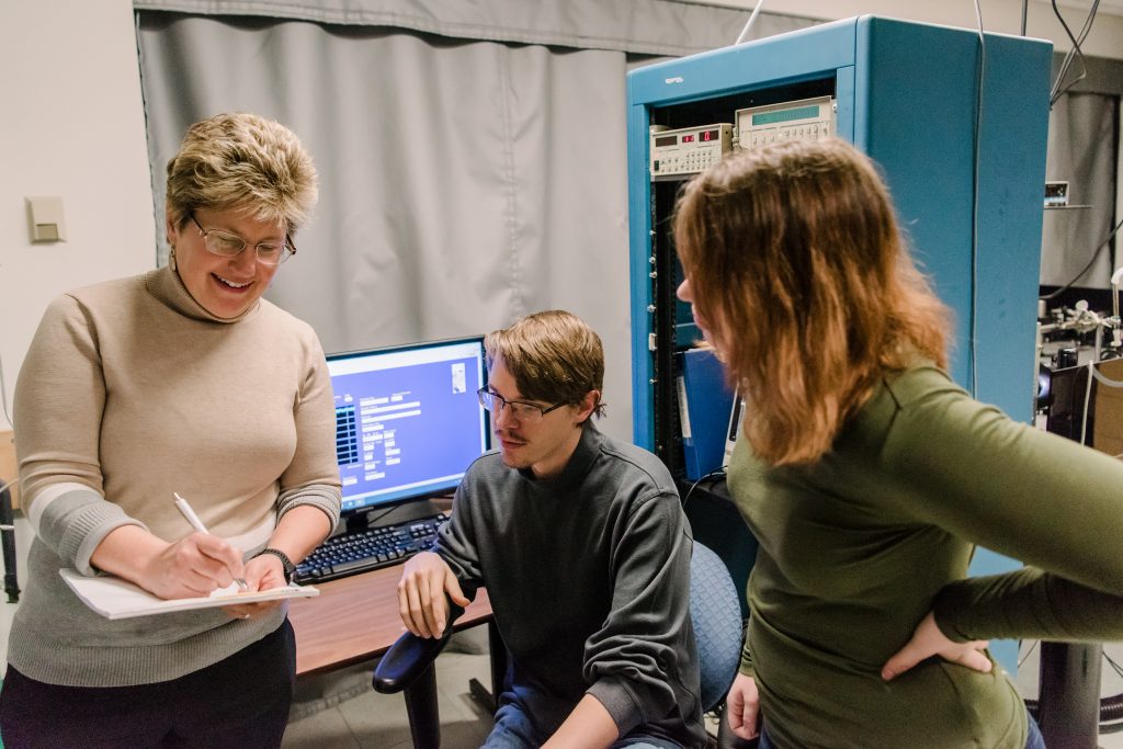 Lisa Kelly, Ryan Grant, and Gabrielle Pozza (left to right) discuss results from a recent experiment in the lab.