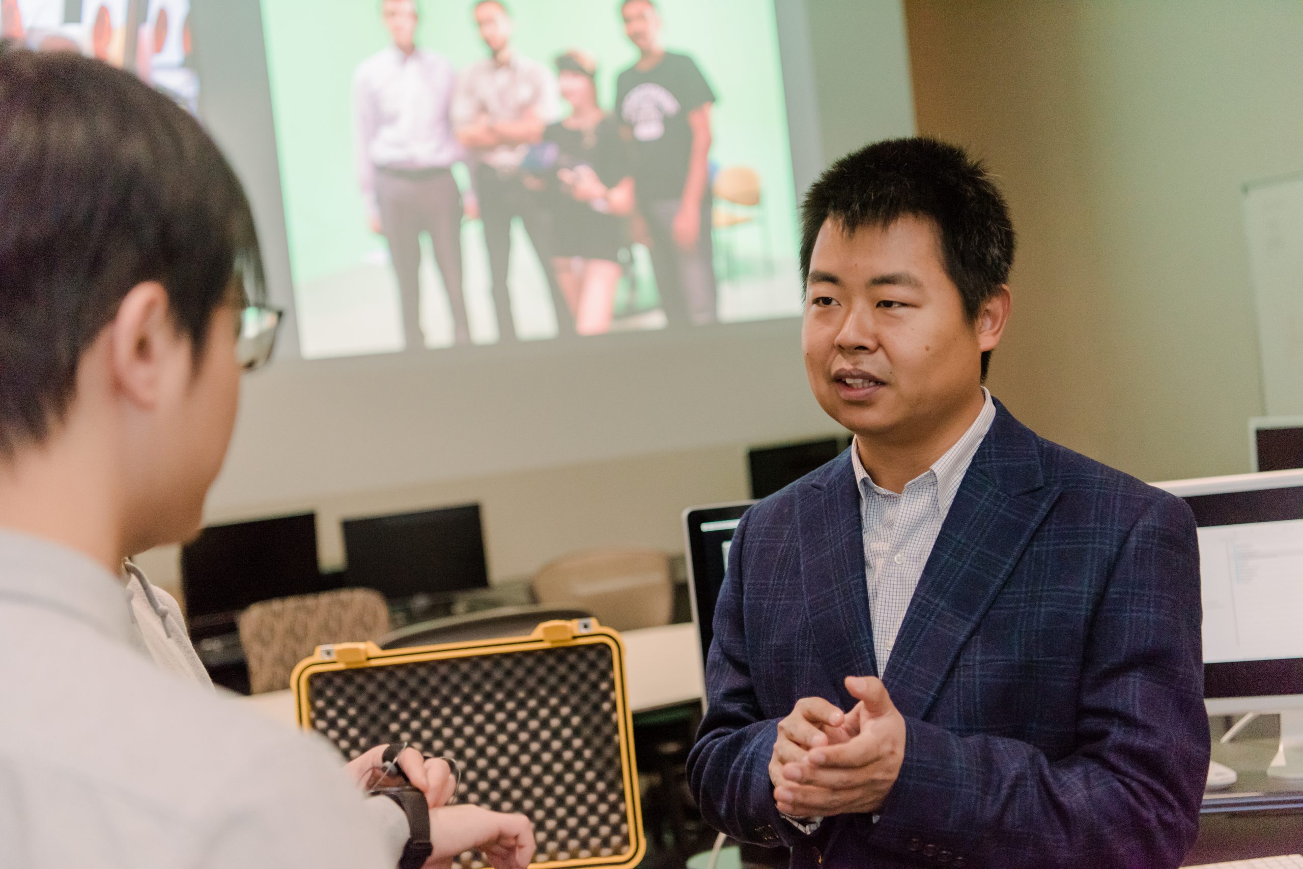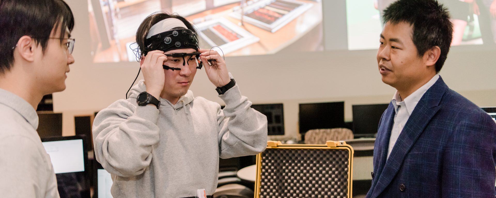 Banner image: Jiaqi Gong, right, working with Dae-young Leroy Kim, Ph.D. ’25, information systems, and Xishi Zhu ’23, information systems. Photo by Marlayna Demond ’11 for UMBC.