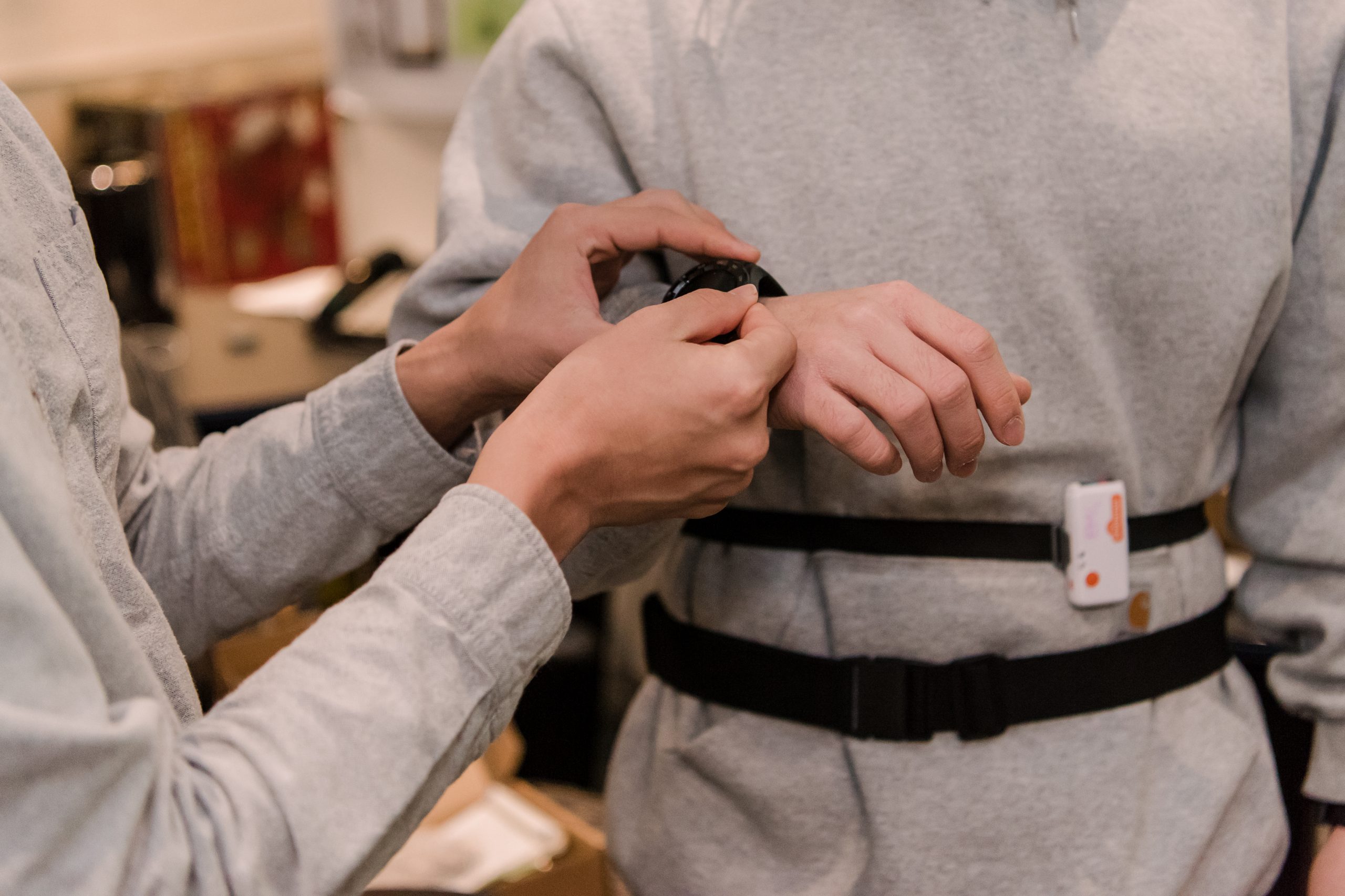 The wearable sensors being used in Jiaqi Gong’s research. Photo by Marlayna Demond ’11 for UMBC.