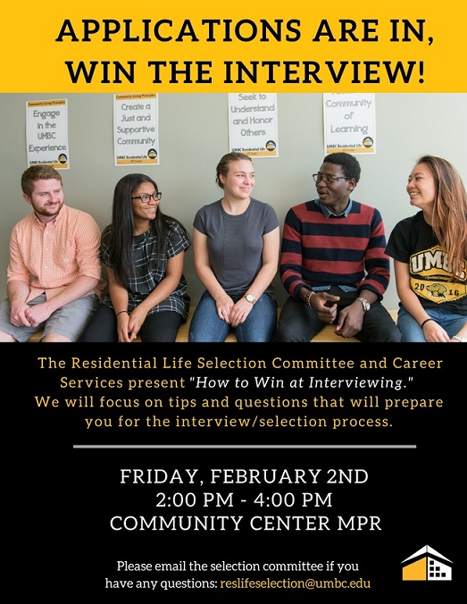 The Residential Life Selection Committee will be partnering with The Career Center to host a "How to Win at Interviewing" session, Friday, February 2, 2018 from 2:00pm to 4:00pm Community Center Multipurpose Room. This event is for all paraprofessional candidates for the 2018-2019 academic year.