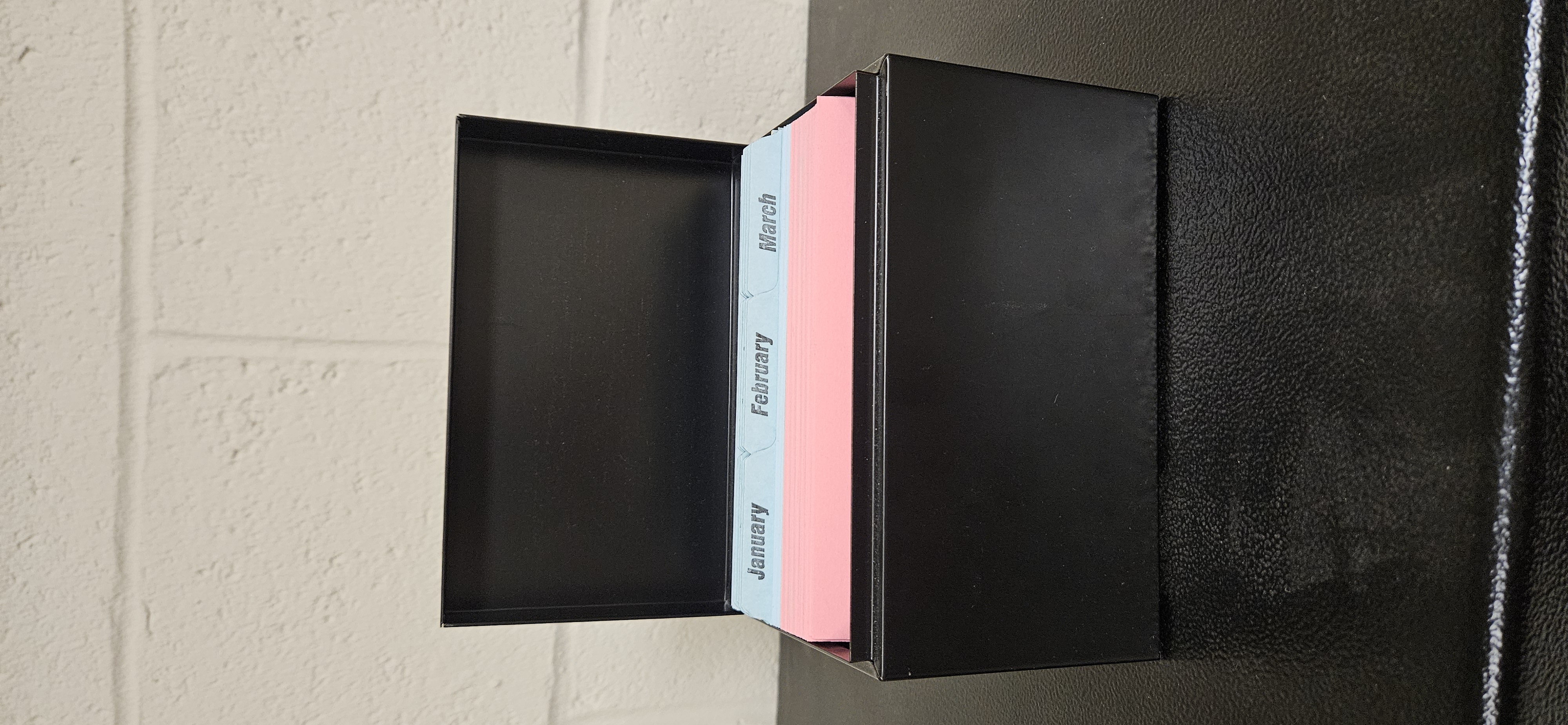 - 2 index card boxes (1 large empty, 1 small with monthly dividers and cards)