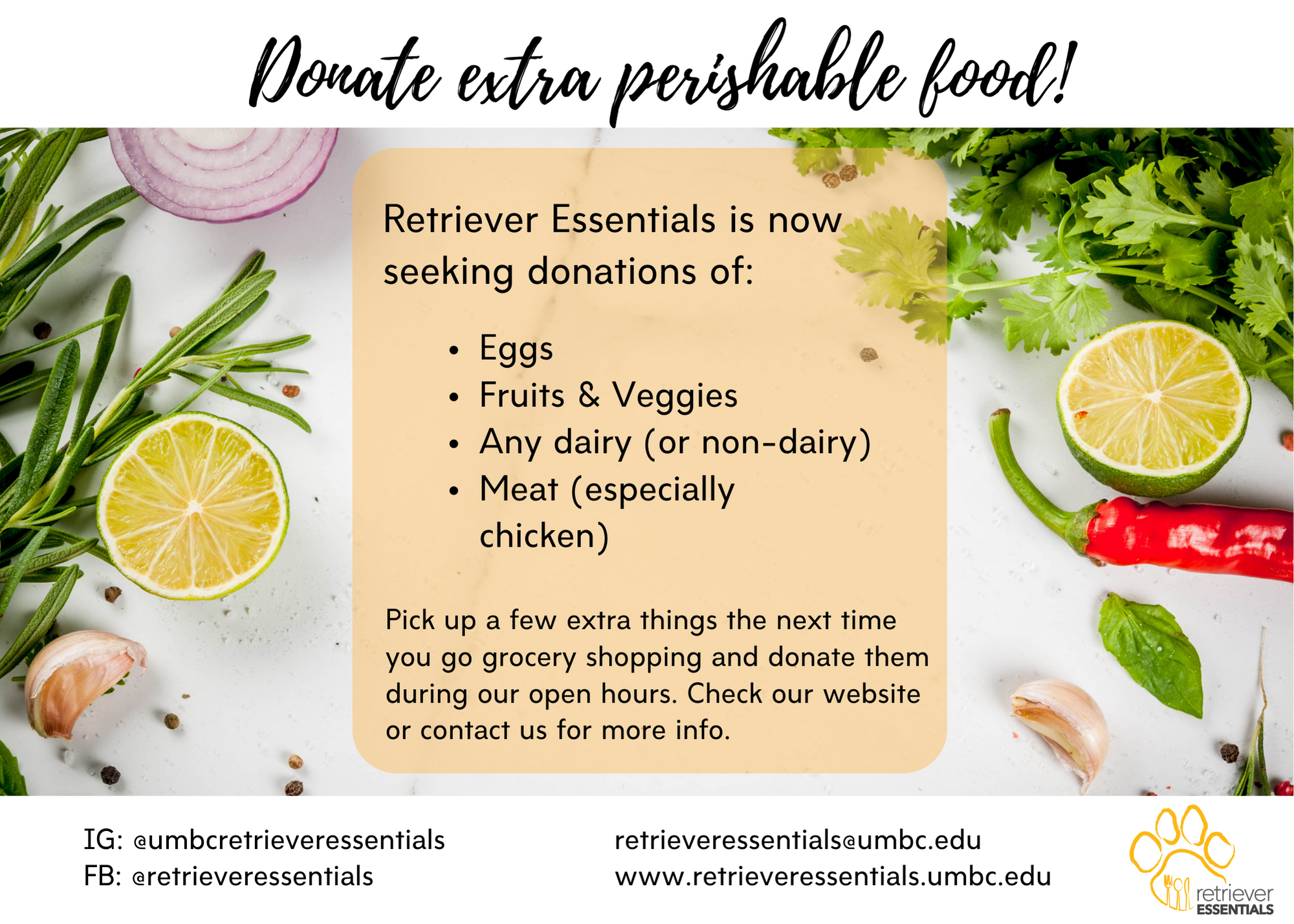 Retriever Essentials is now accepting perishable donations. Consider picking up a few things next time you're at the grocery store and bring them to us during our open hours.