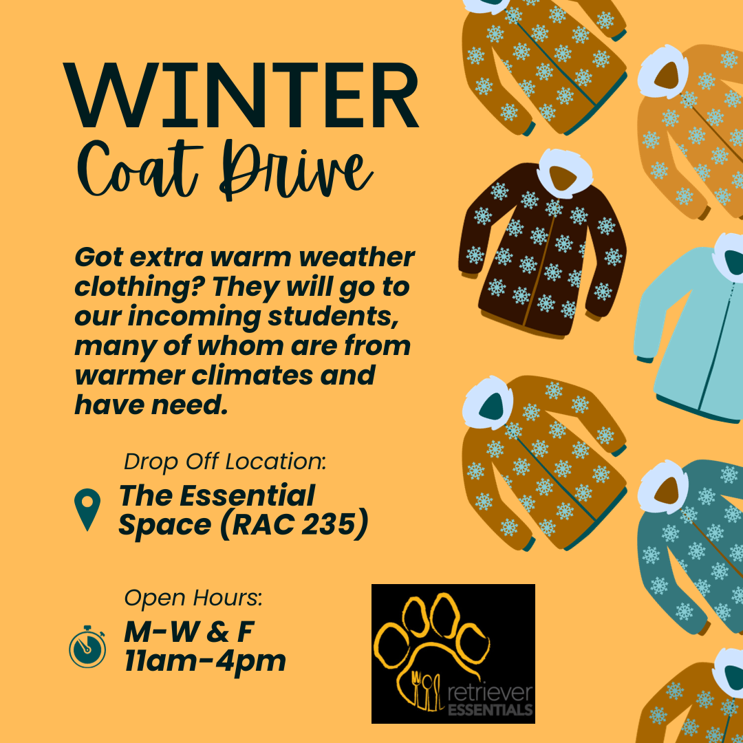 Please consider bringing in any winter wear you have to The Essential Space in RAC 235. Our hours are M-W and Friday 11am to 4pm. We are of course closed today, but plan to reopen tomorrow!