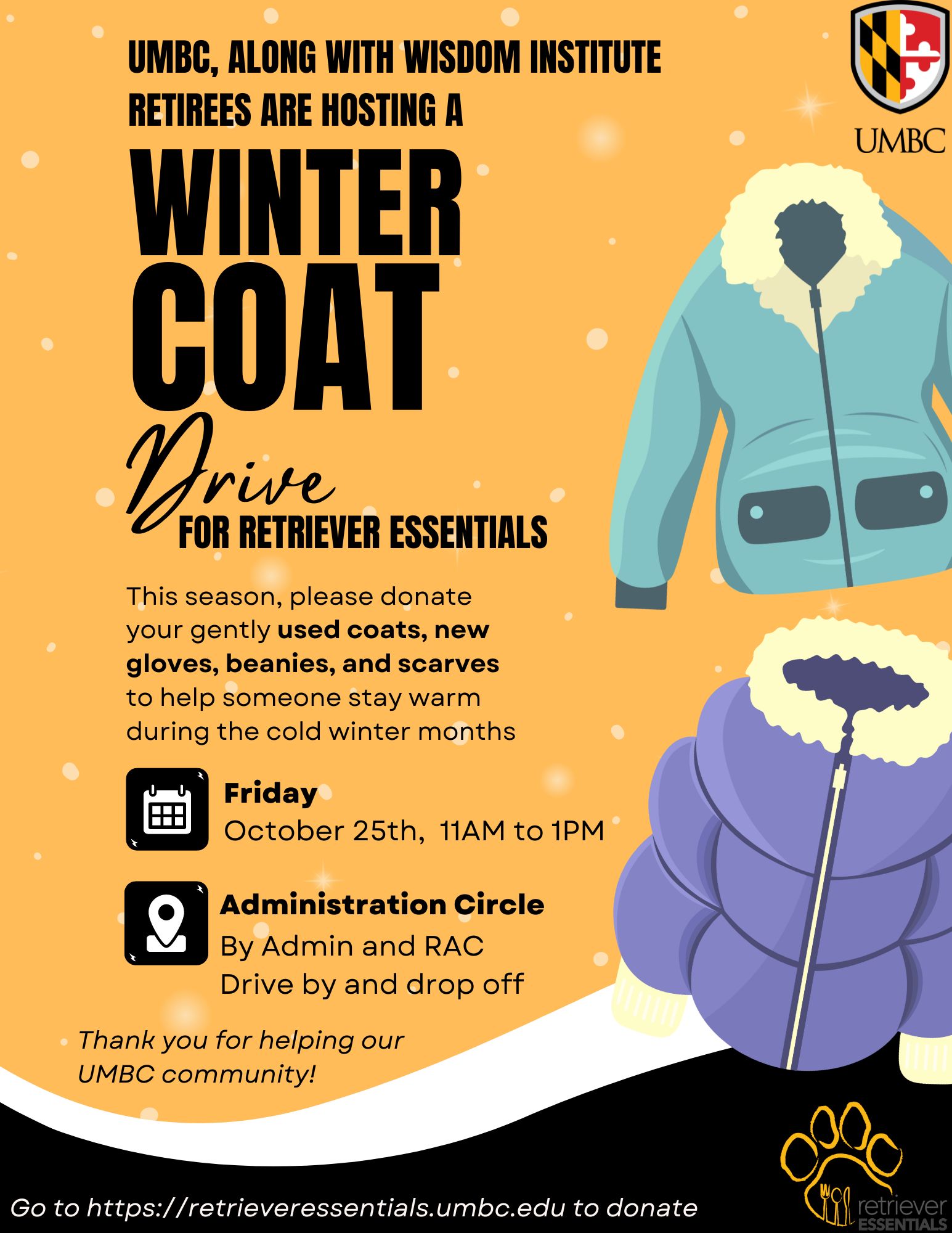 Look out for the upcoming COAT DRIVE on October 25th, between 11AM and 1PM, in partnership with Wisdom Institute! Located at the Administration Circle. Please consider donating your gently used coats, new gloves, scarves, beanies, and sweaters. Drive by and drop off or bring by hand! Thank you so much!