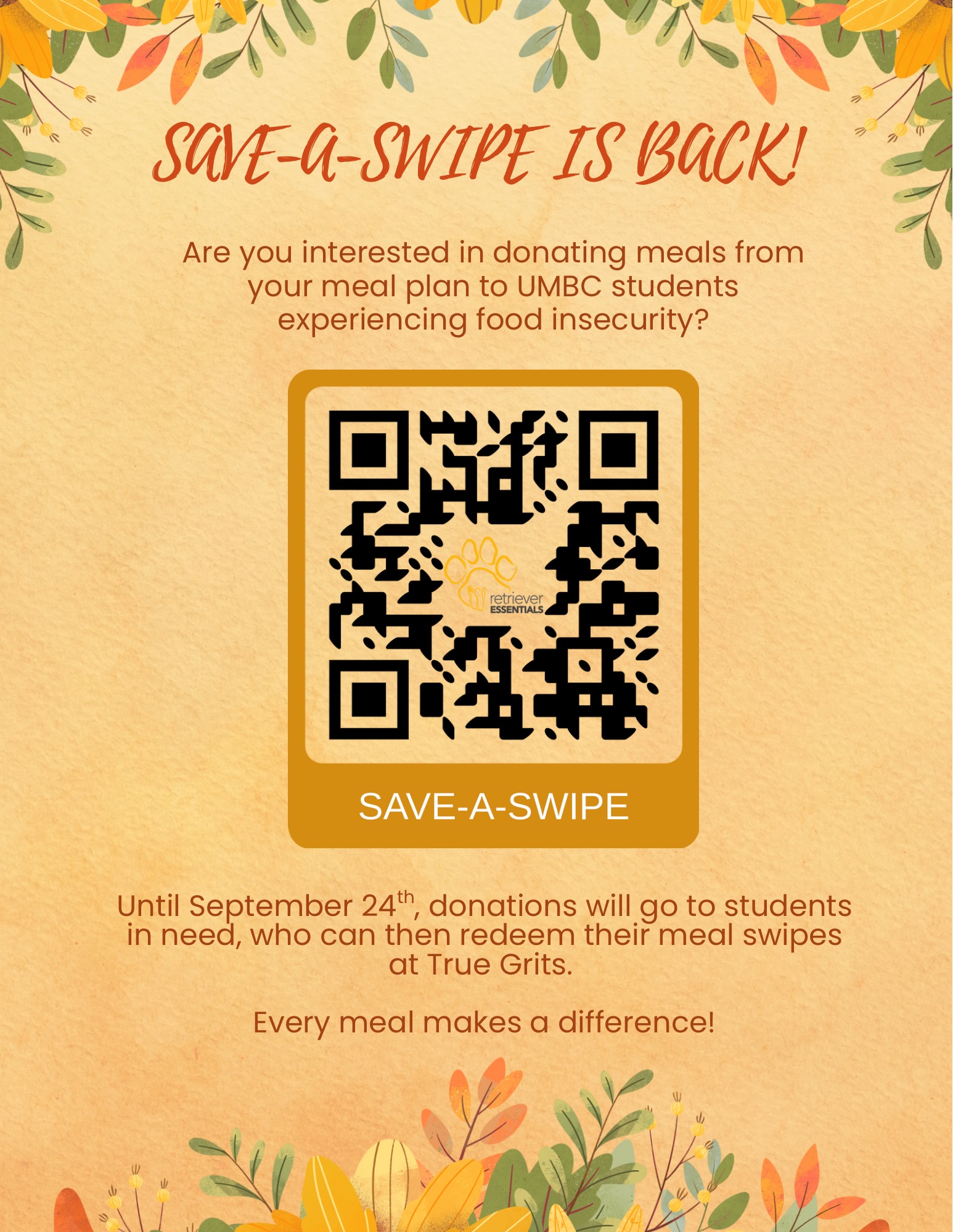 Feel like making a difference in your community? If you own a meal plan through UMBC, you are eligible to donate to our Save-a-Swipe program! You can donate 5-10 meals to Save-a-Swipe, where they will be pooled and delegated to students experiencing food insecurity later in the semester. We are very happy to announce that our program is back for the fall semester, and we look forward to how many lives we can change!