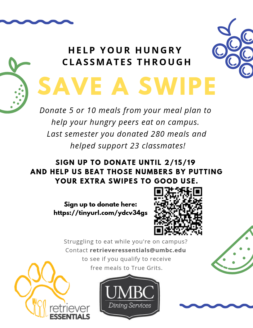 If you struggle to eat while you're on campus, email retrieveressentials@umbc.edu to see if you qualify to receive free meals to True Grits through the Save a Swipe program.
