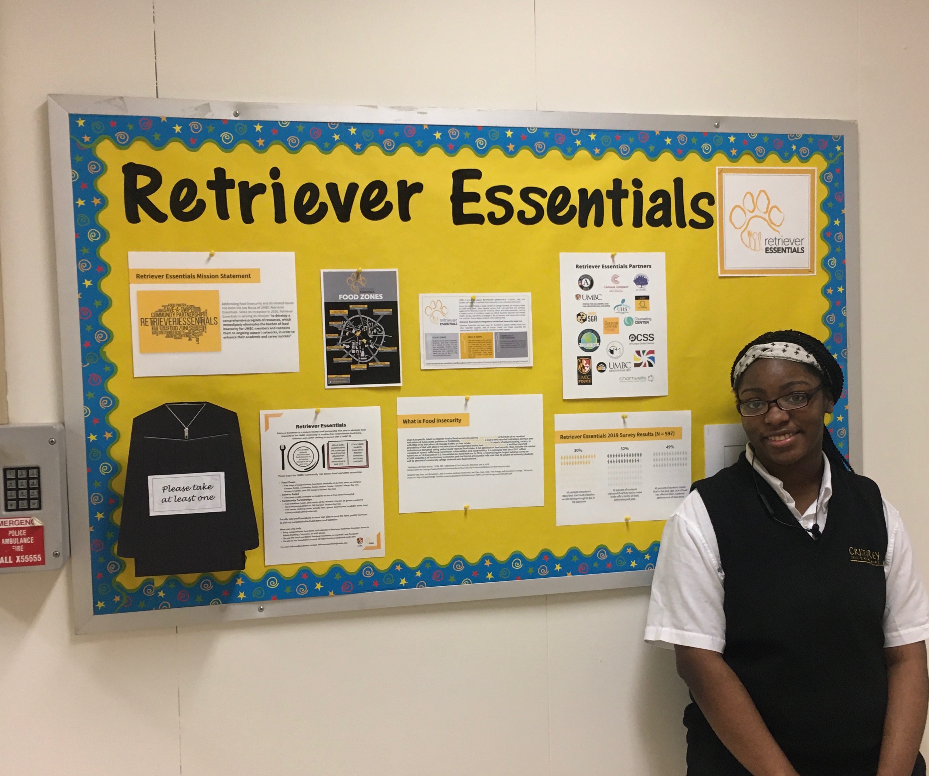Kimani from Cristo Rey High School brought in her creative skills and helped design this bulletin board for Retriever Essentials. Please stop at Sherman 205 to check it out. The food pantry in Sherman 205 will be opening soon.