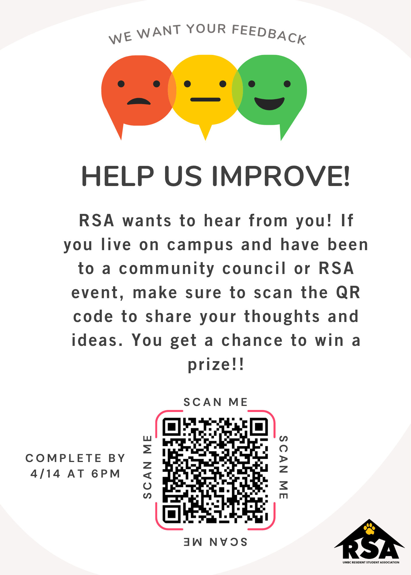 RSA wants to hear from you! If you live on campus and have been to a community council or RSA event, make sure to scan the QR code or click the link attached to share your thoughts and ideas. If you complete the survey, you get a chance to win a prize!! Make sure to complete the survey by Thursday, April 14th.