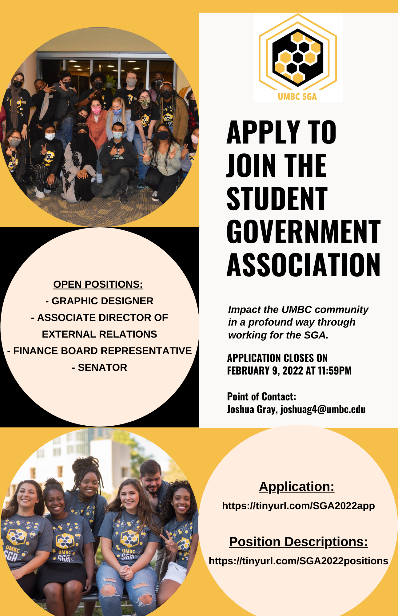 If you have been looking for your chance to get involved at UMBC, here is your opportunity. Please apply for a vacancy in the Student Government Association! All position descriptions are below as well as the application.