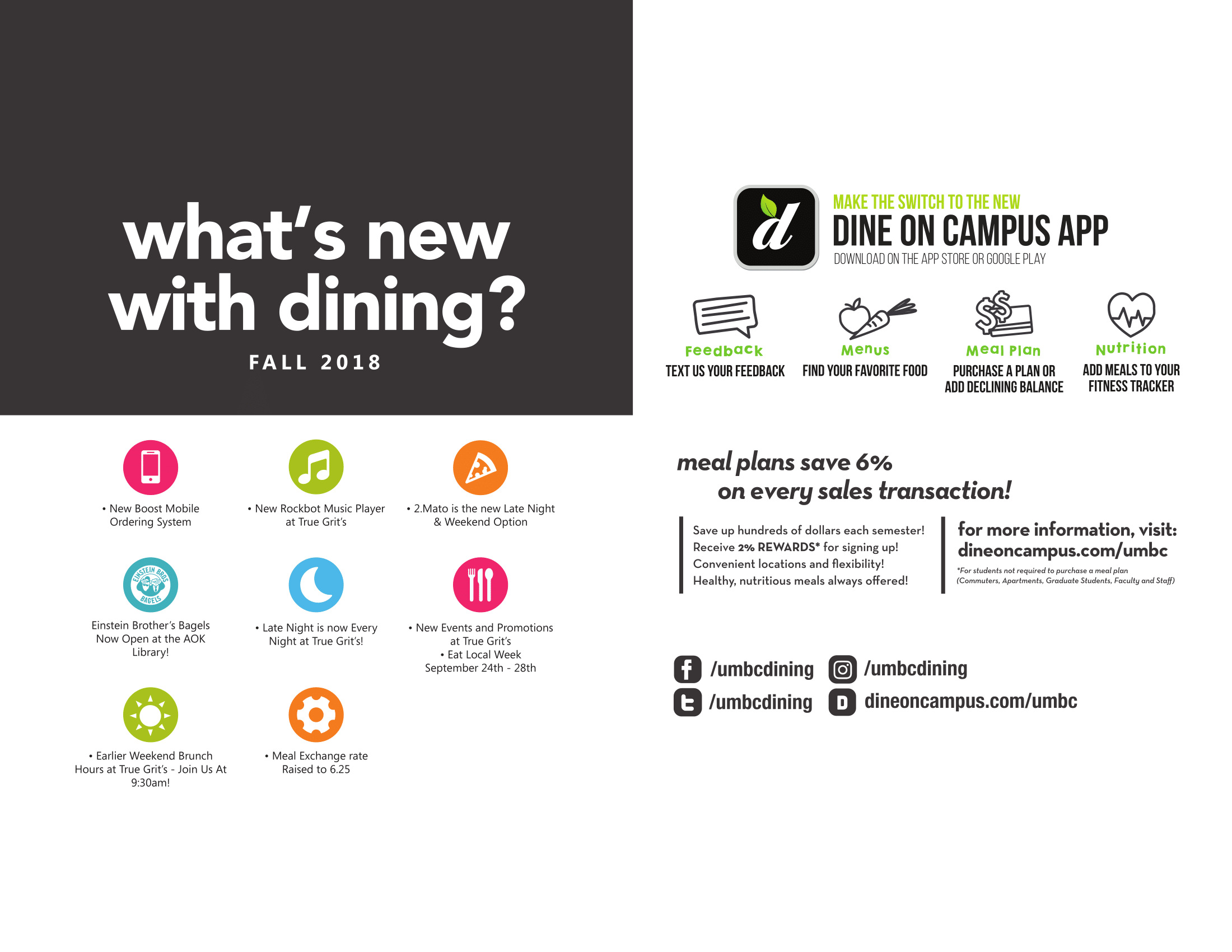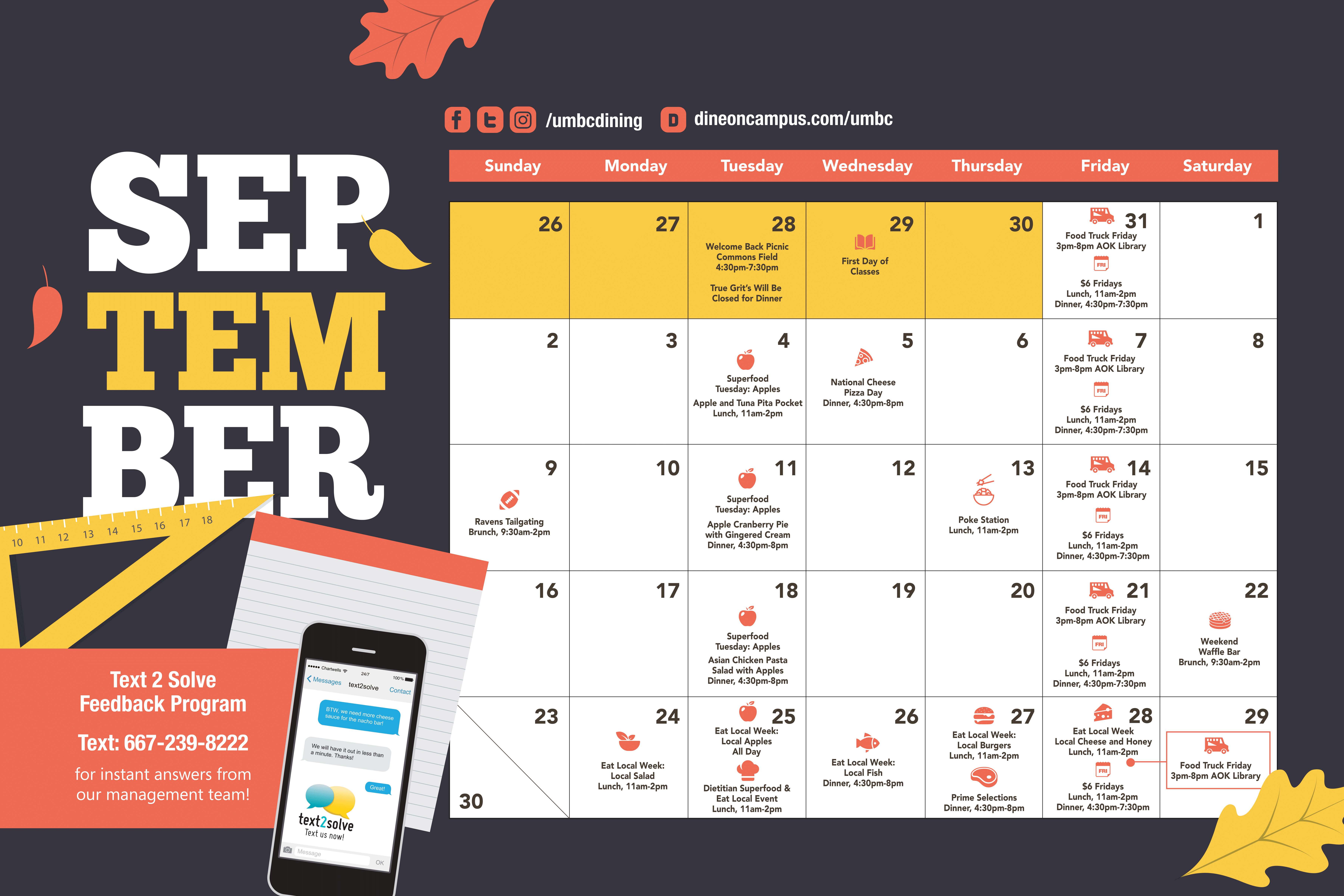 Check out Fall 2018 dining hours, a dining events calendar for September, and a summary of all the new options this semester below!!