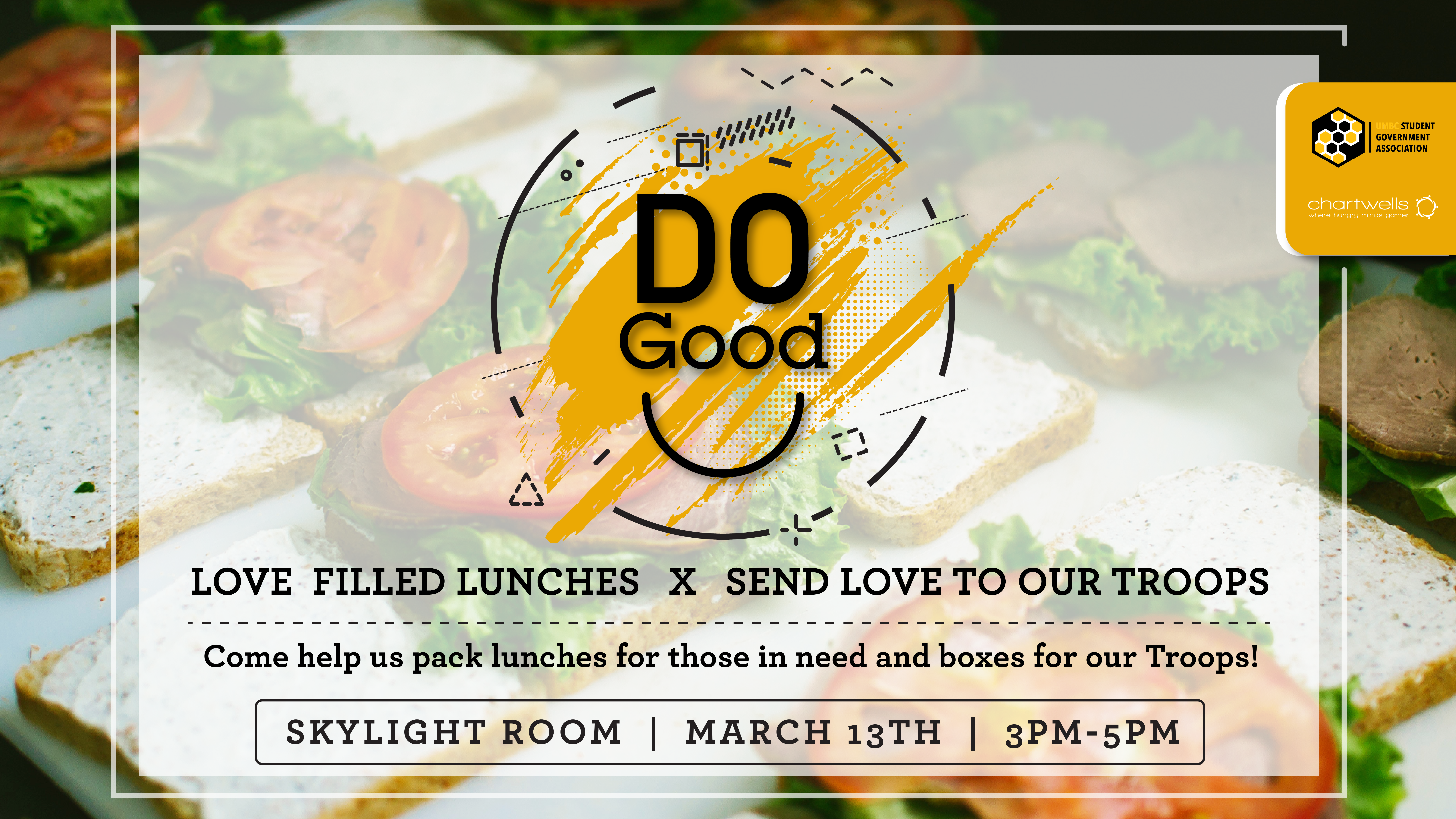 Join us in the Skylight room on Wednesday (3/13) from 3:00 - 5:00pm, and help us pack lunches for charity and/or care packages for our US troops! Free food will be provided! See attached flyer for details.