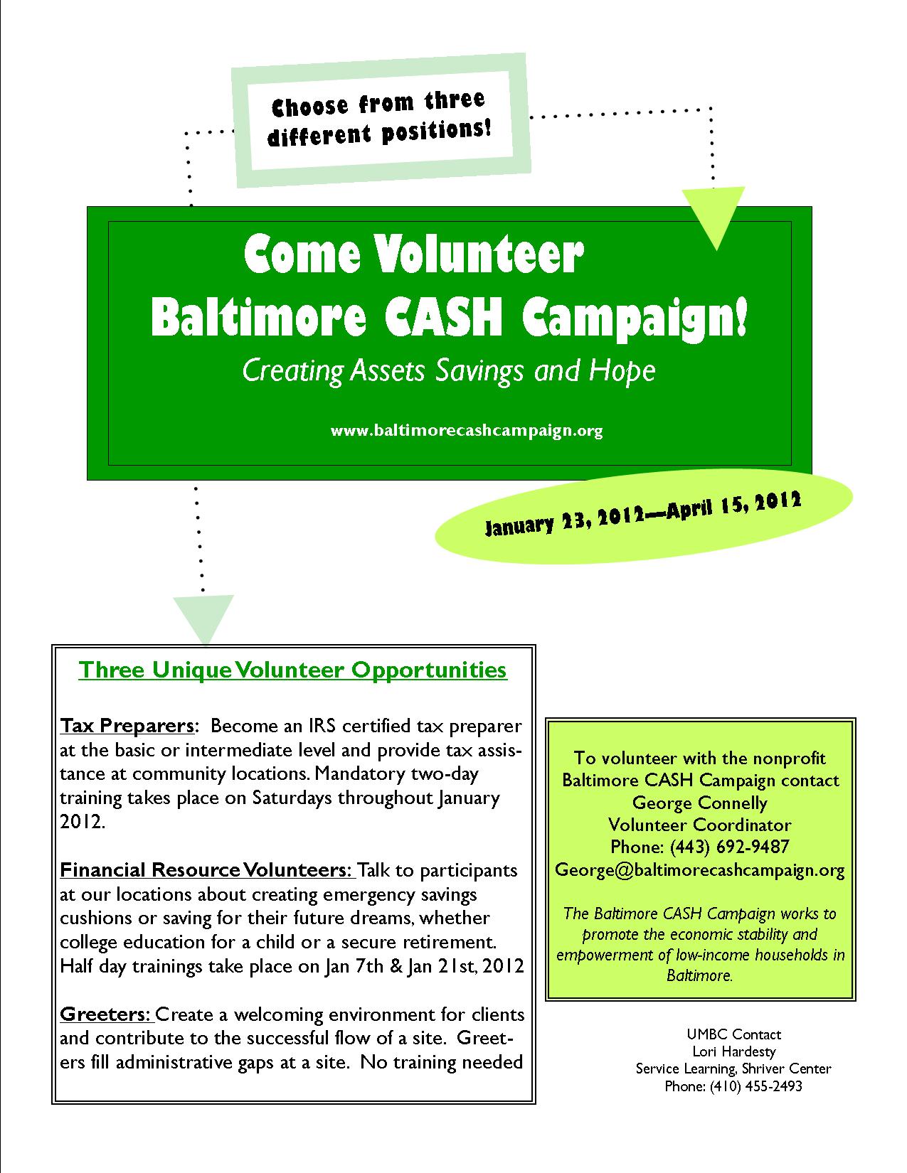 Trainings for tax season begin in January 2012. Contact George Connelly, Volunteer Coordinator, at 443.692.9487 or George@baltimorecashcampaign.org.