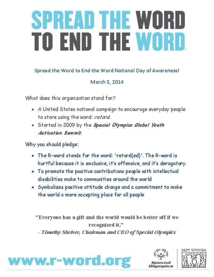 For more info on the event, please read the guest post from ThuyVy Duong, who works with SUCCESS (Students United for Campus-Community Engagement for Post-Secondary Success), a partnership of UMBC and the Maryland Department of Disabilities. SUCCESS is the first 4-year college experience for young adults with intellectual disabilities in Maryland at http://critsocjustice.wordpress.com/2014/02/26/why-im-spreading-the-word-to-end-the-word/