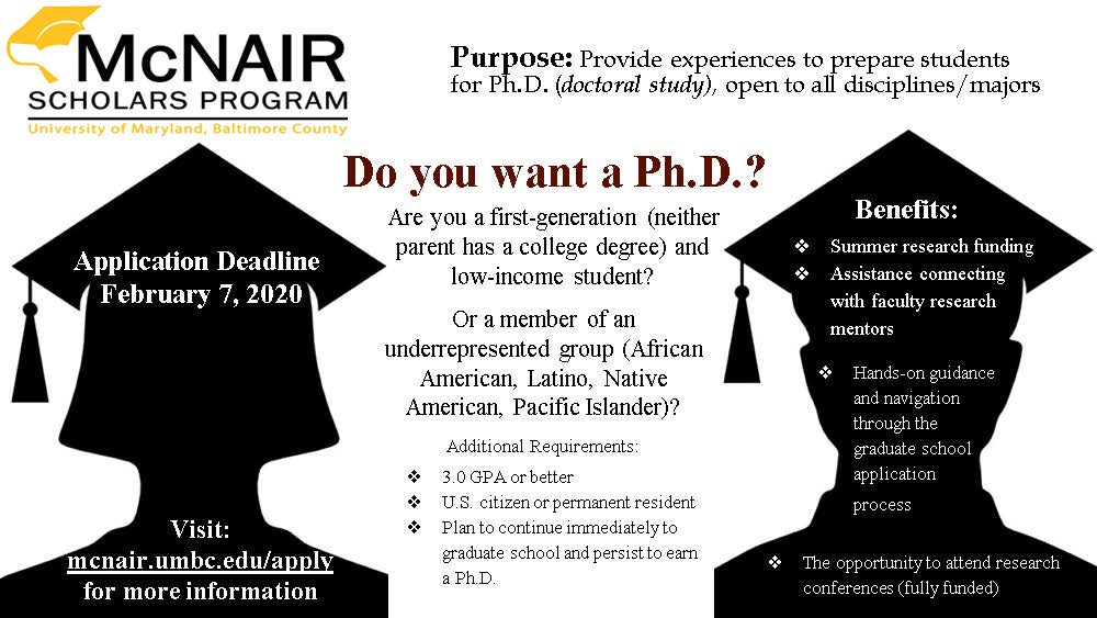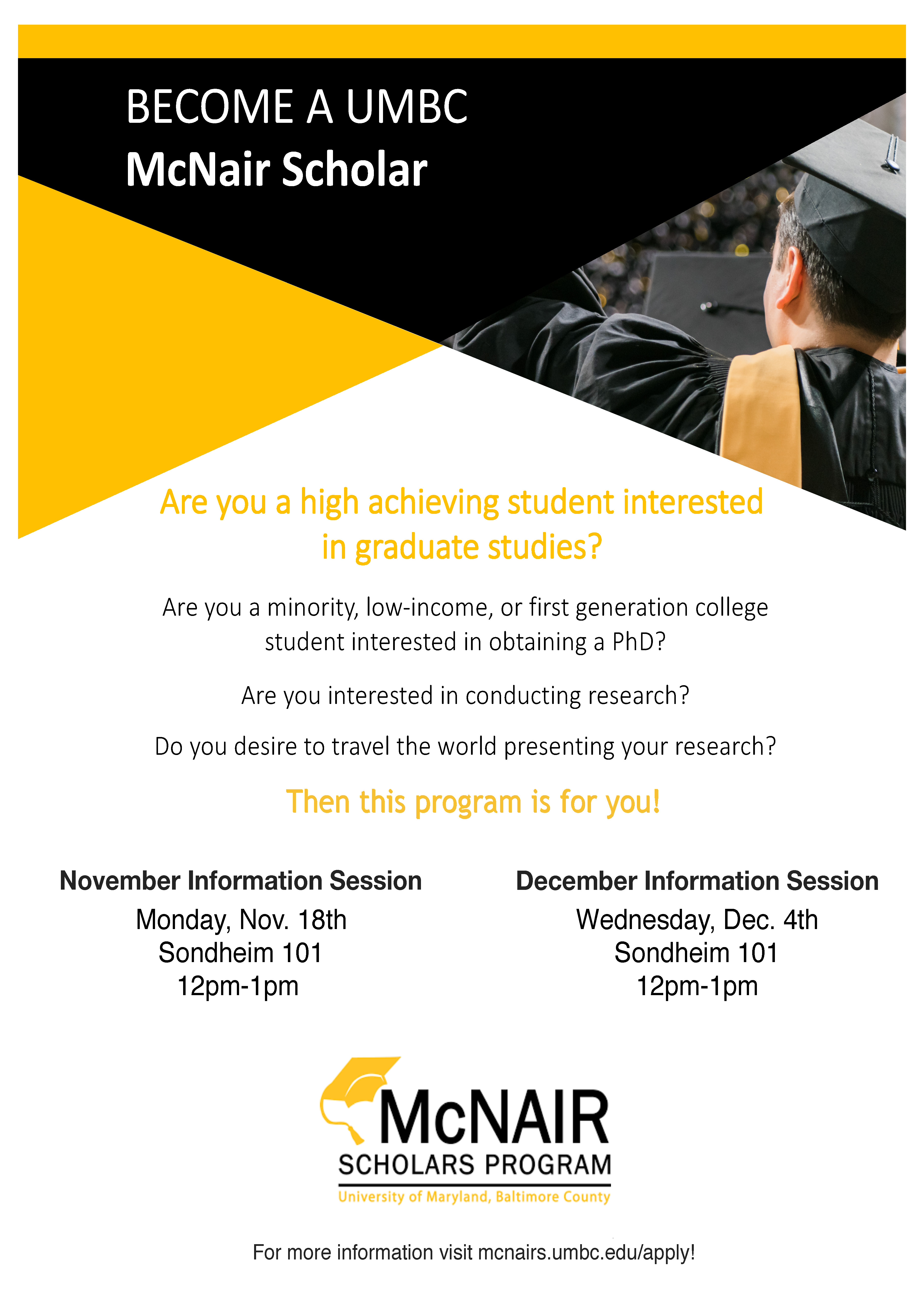 For any students interested in the UMBC McNair Scholars Program, attend one of the open houses on Nov 18th, Dec 4th, January 29th, 12 pm - 1 pm, Sondheim 101. Missed the event(s)? Please reach out to staff mcnairs@umbc.edu to set up a 1on1 meeting. Sign up now on the Interest Form to receive updates (https://docs.google.com/forms/d/e/1FAIpQLSf2Mj0Bd9kiunv_S7i-ERwd3x8YoNTxqdQIfCngPzcol3Rtxg/viewform)