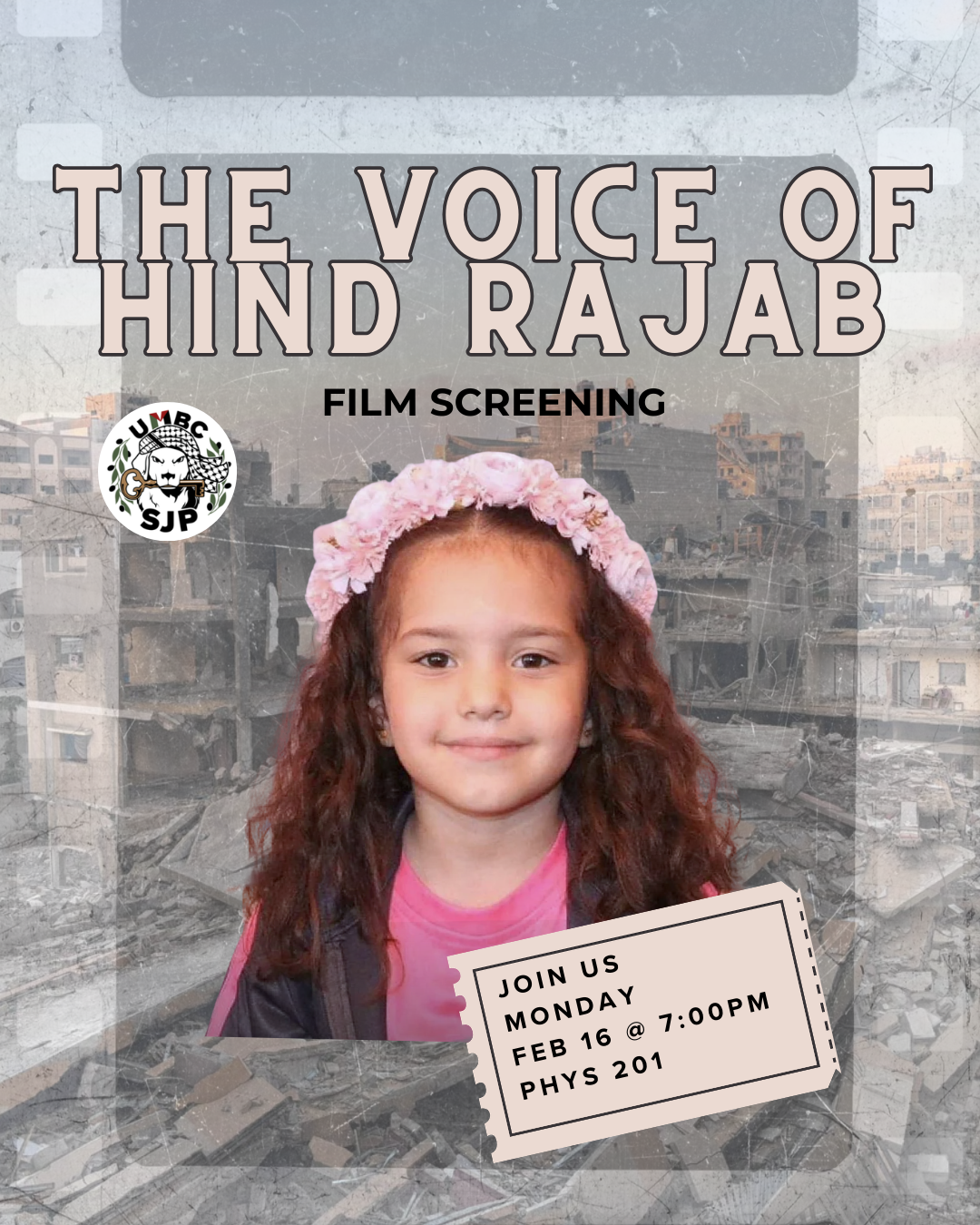 Join us on Monday, February 16th at 7pm in Physics Building, Room 201 for a film screening of "The Voice of Hind Rajab", a film documentary about the 5-year old Palestinian girl whose call for help reached the entire world. The film is a memorial to the courage of those first responders and a tribute to the life of a little girl whose name will jot be forgotten.