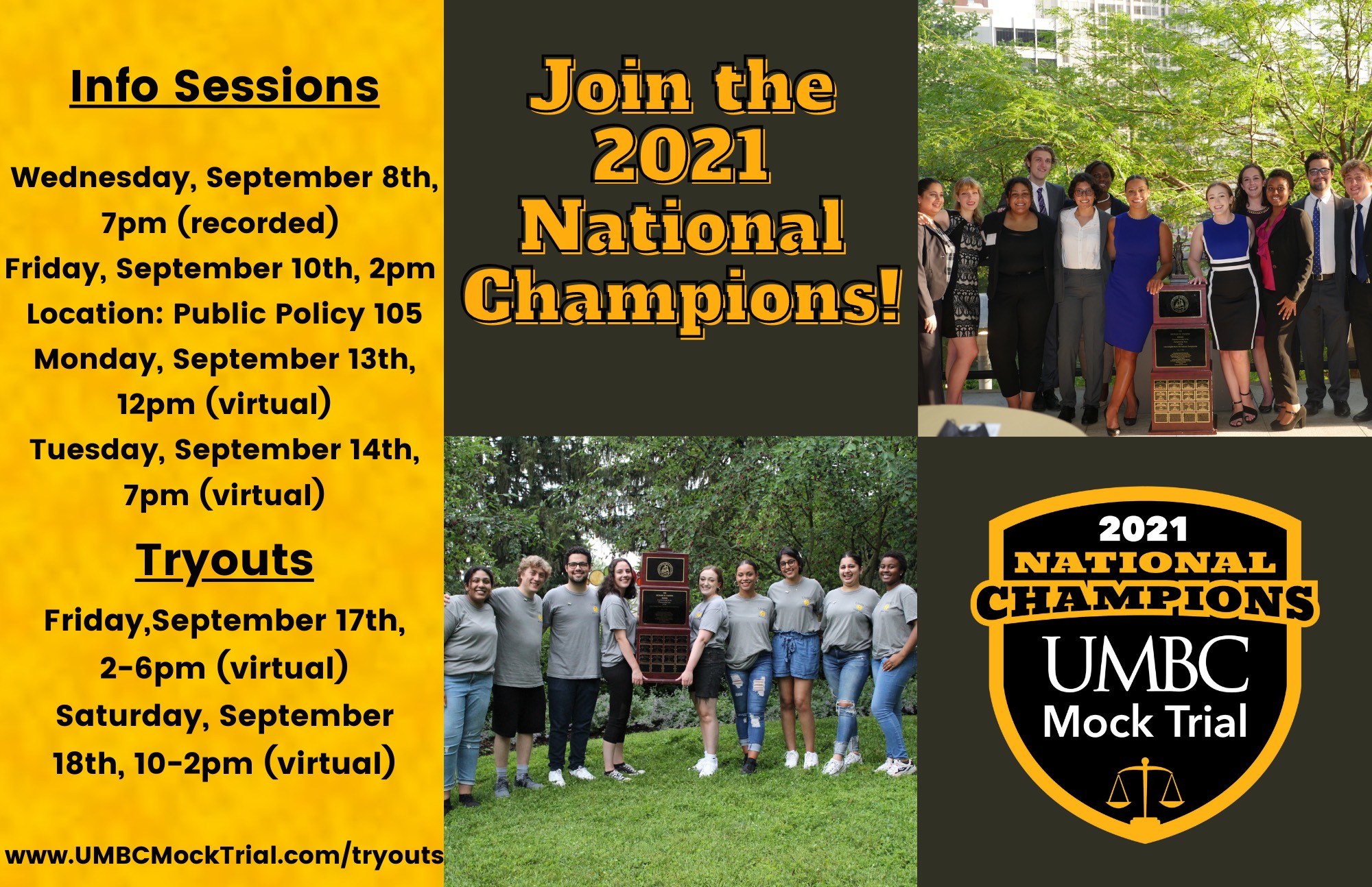 Our last info session is tomorrow, September 14th at 7pm over zoom. We strongly recommend you attend an info session to learn more about the team, how Mock Trial works, and how our tryouts work. If you can’t make it, we also have an info session recording up on our YouTube page. Go to www.UMBCMockTrial.com/tryouts to learn how to register for a tryout, download the tournament packet, and find the Zoom links for each info session.