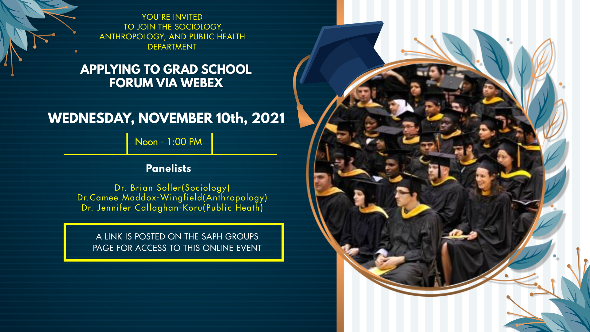 The Department of Sociology, Anthropology and Public Health(SAPH) would like to invite you to this semester's virtual graduate school forum. Join us to learn more about applying to graduate school from our panelist, Dr.Brian Soller (Sociology), Dr. Camee Maddox- Wingfield (Anthropology), and Dr. Jennifer Callaghan-Koru (Public Health formerly HAPP). All majors are welcome!
