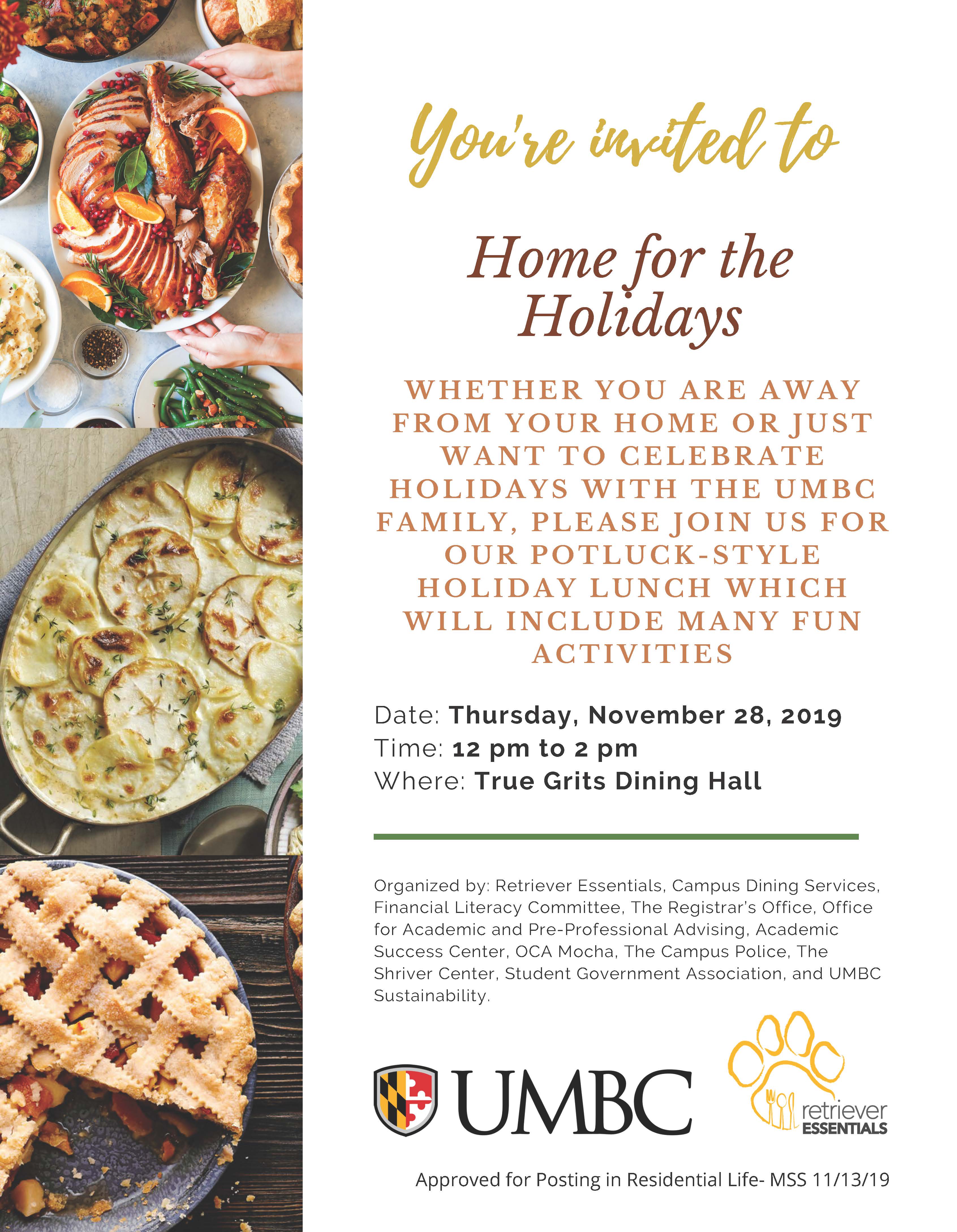 Retriever Essentials and the collaborators would like to extend our warmest invitation to you at our first seasonal Home for the Holiday Lunch on Thursday, November 28th, 2019, 12p-2p in the True Grits Dining Hall.
