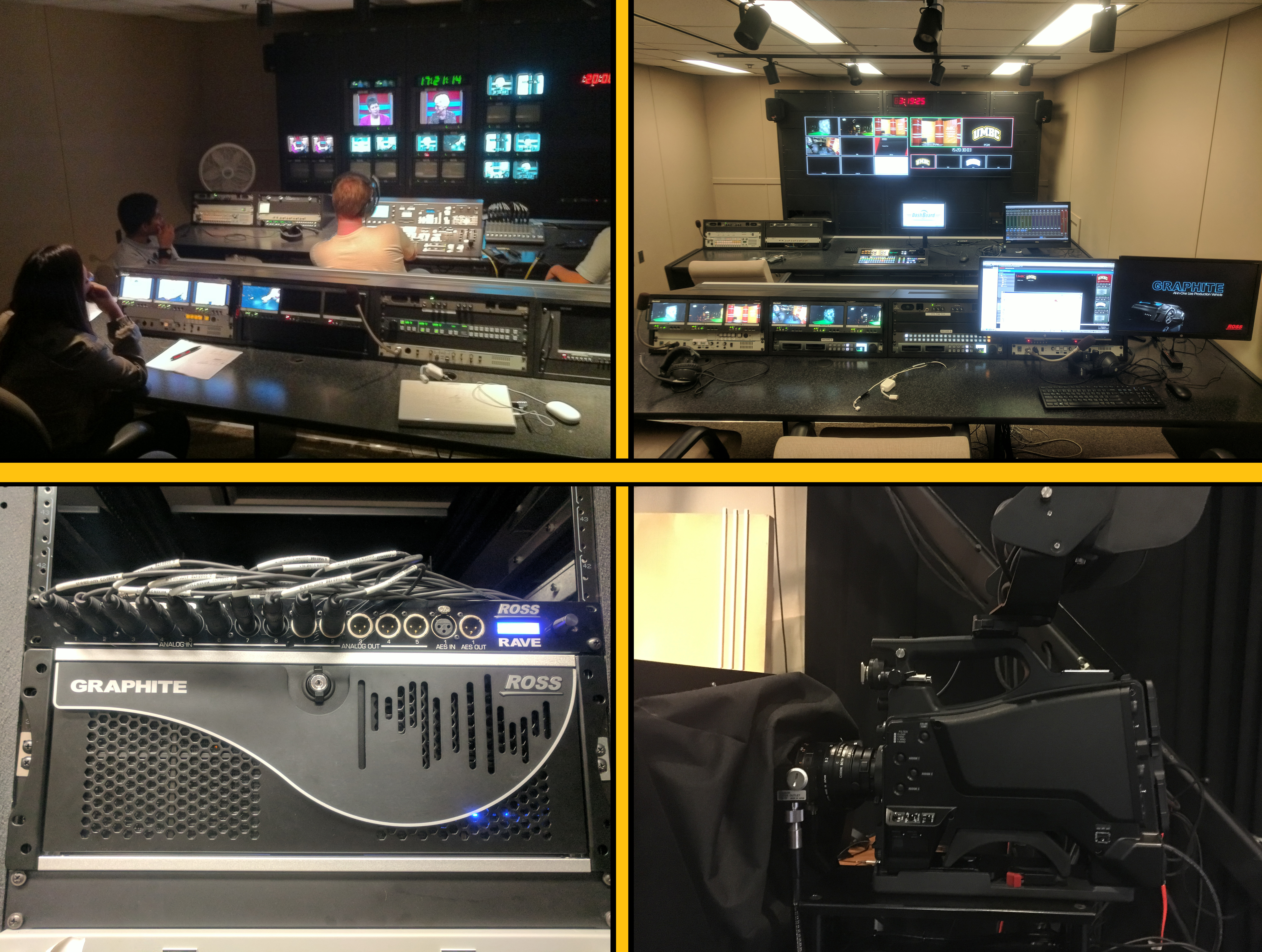 Clockwise From Top Left: The Studio’s control room with old analog tube monitors; same room with updated controls, new flat screen monitors and digital equipment, added graphics and media manager stations; one of three new HD Sony cameras with fiber optic cabling; and Ross Graphite Switcher- the main unit of the system.