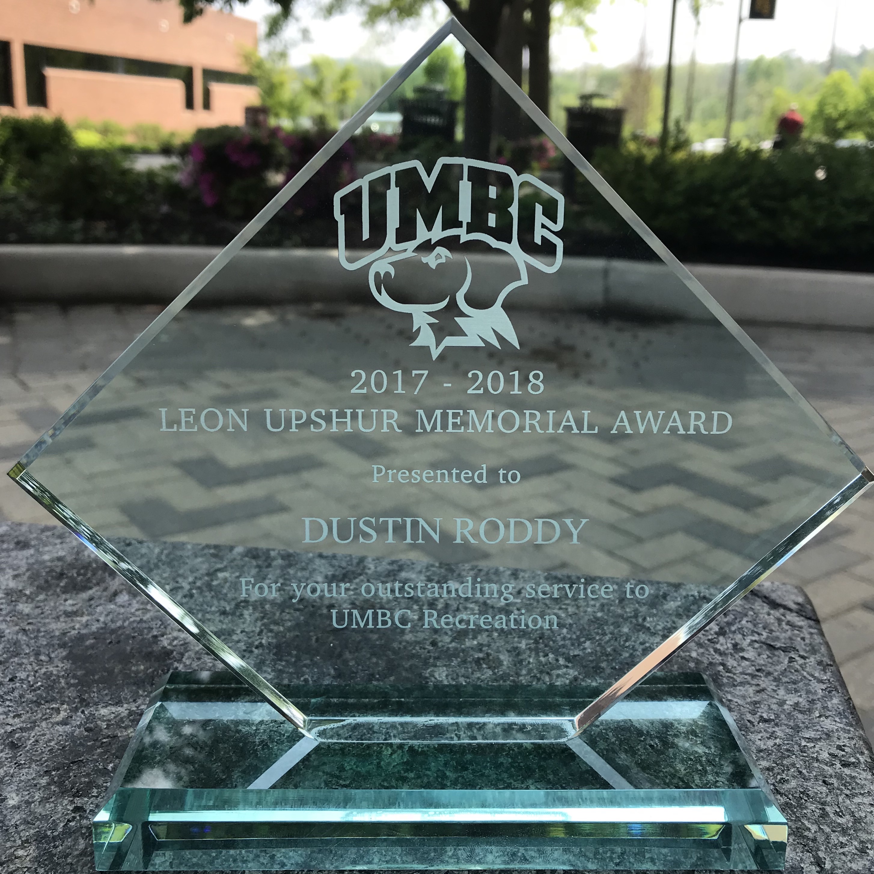 During its annual "Gritty Awards" last Wednesday, May 7, UMBC Athletics went "off script" and surprised DoIT's Dustin Roddy, by awarding him the 2017-18 Leon Upshur Memorial Award for "outstanding service to UMBC Athletics." Upshur was a much-loved equipment room supervisor for more than 20 years, who "asked for and received very little fanfare" said Sports Information Director Steve Levy. "He simply got the job done quietly and efficiently."