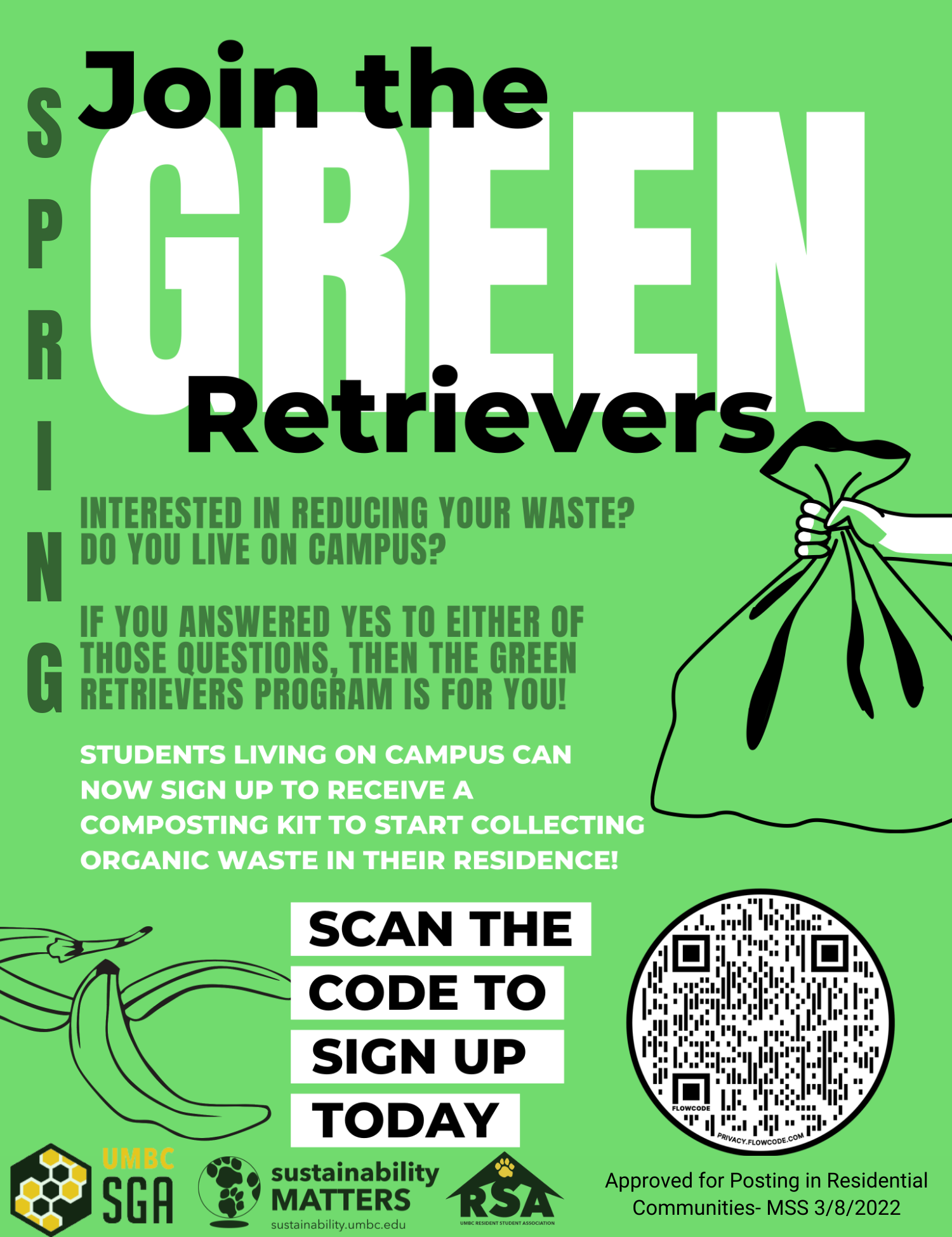 The Green Retriever Residential Composting Program is a collaboration between the UMBC Sustainability Office, the Student Government Association, Residential Student Association, and UMBC Dining to provide a composting drop off location for residential students. This will allow students living on campus to collect organic waste in their residence to be composted.