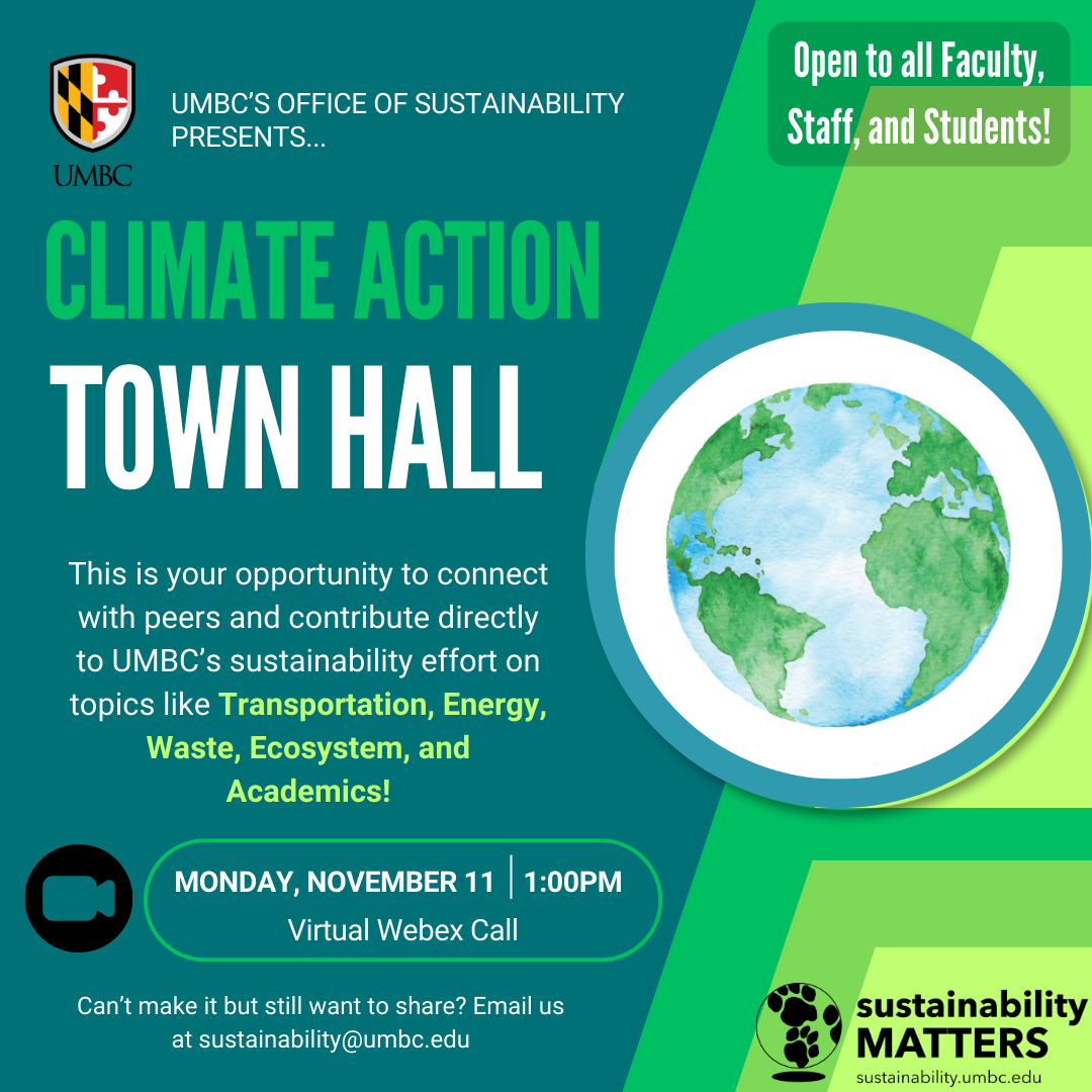 Have questions, concerns, or ideas related to climate action or sustainability on campus? Jump on and join the Office of Sustainability to share and contribute to our update of UMBC's Climate Action Plan today at 1:00!