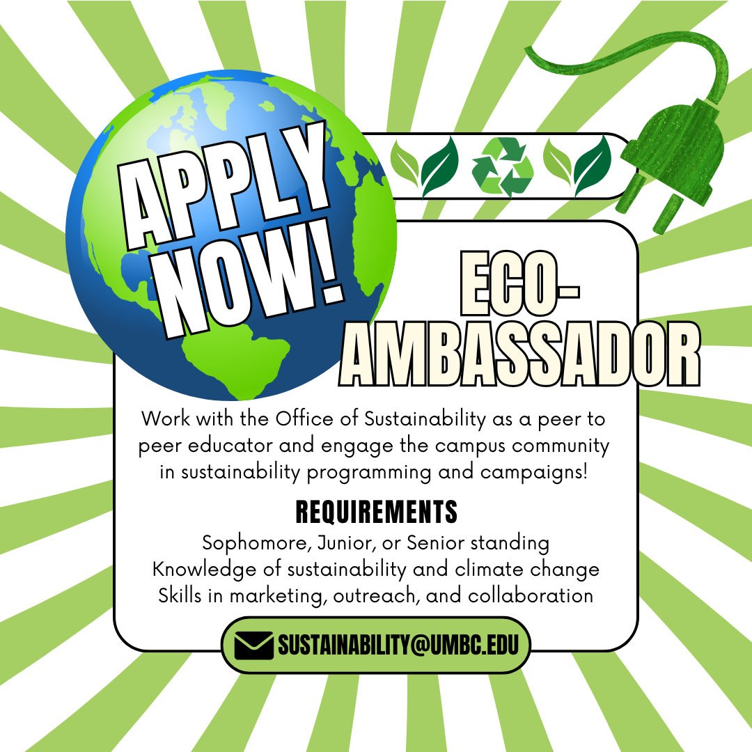 Passionate about environmental issues and have ideas to improve campus sustainability efforts? Want to work on issues like zero waste, transportation, social justice, ecosystem conservation, academics, and more? Apply today to the EcoAmbassador program for the 2025-2026 school year! Find the full job descrinullption and application with this link: