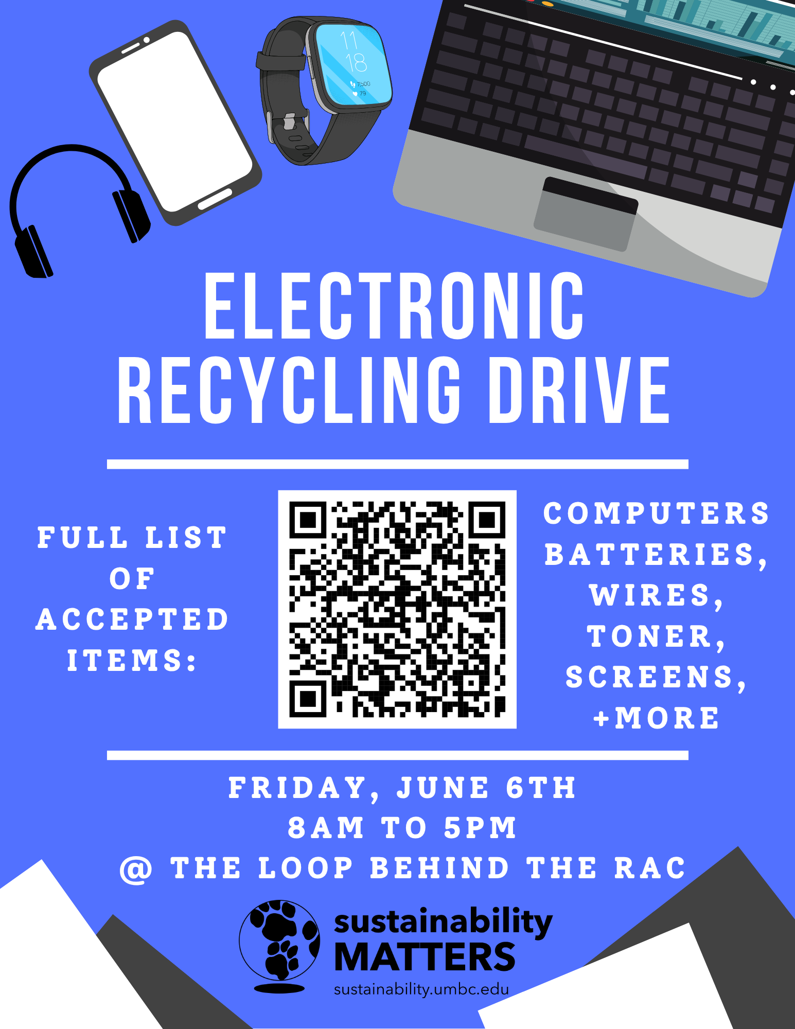 Cant make it on June 6th? Use our e-cycler on The Commons Main Street to drop off e-waste any time, or email us at sustainability@umbc.edu to arrange for larger items.