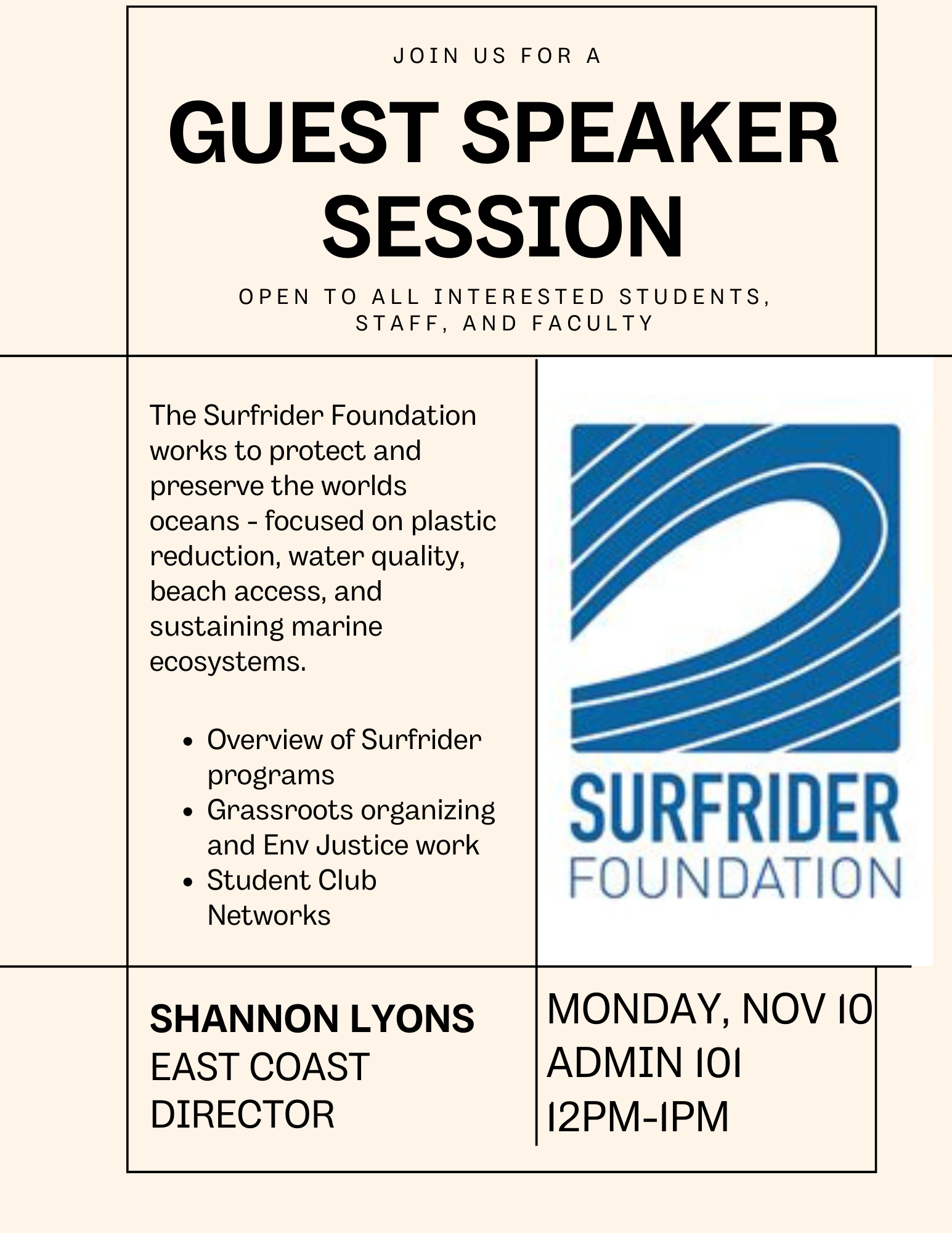 Join us and the GES Department today at 12pm in Admin 101 for a guest speaker session with Shannon Lyons, East Coast Regional Director of the Surfrider Foundation.