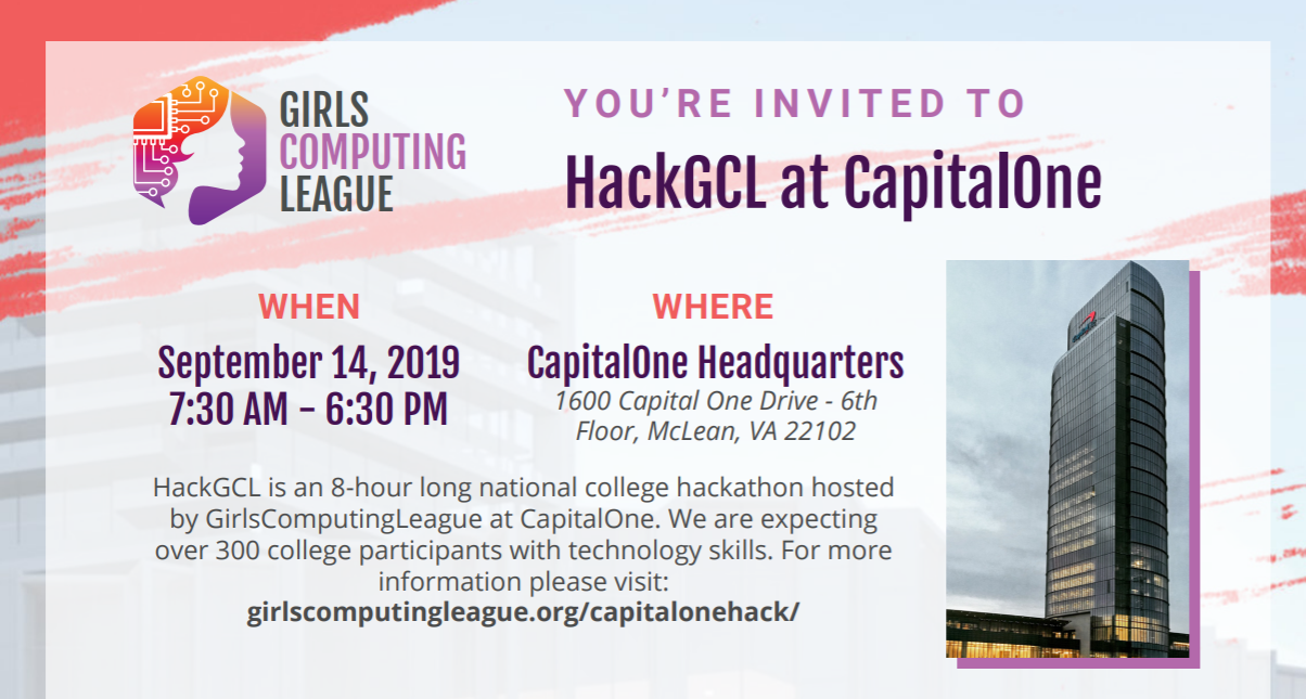 The GirlsComputingLeague InnovateGCL hackathon for college students at CapitalOne headquarters is on September 14. You can win more than $12,000 in cash prizes. Bring your past projects, precode before the hackathon, or code at CapitalOne, with possible help from CapitalOne SMEs. You can also: