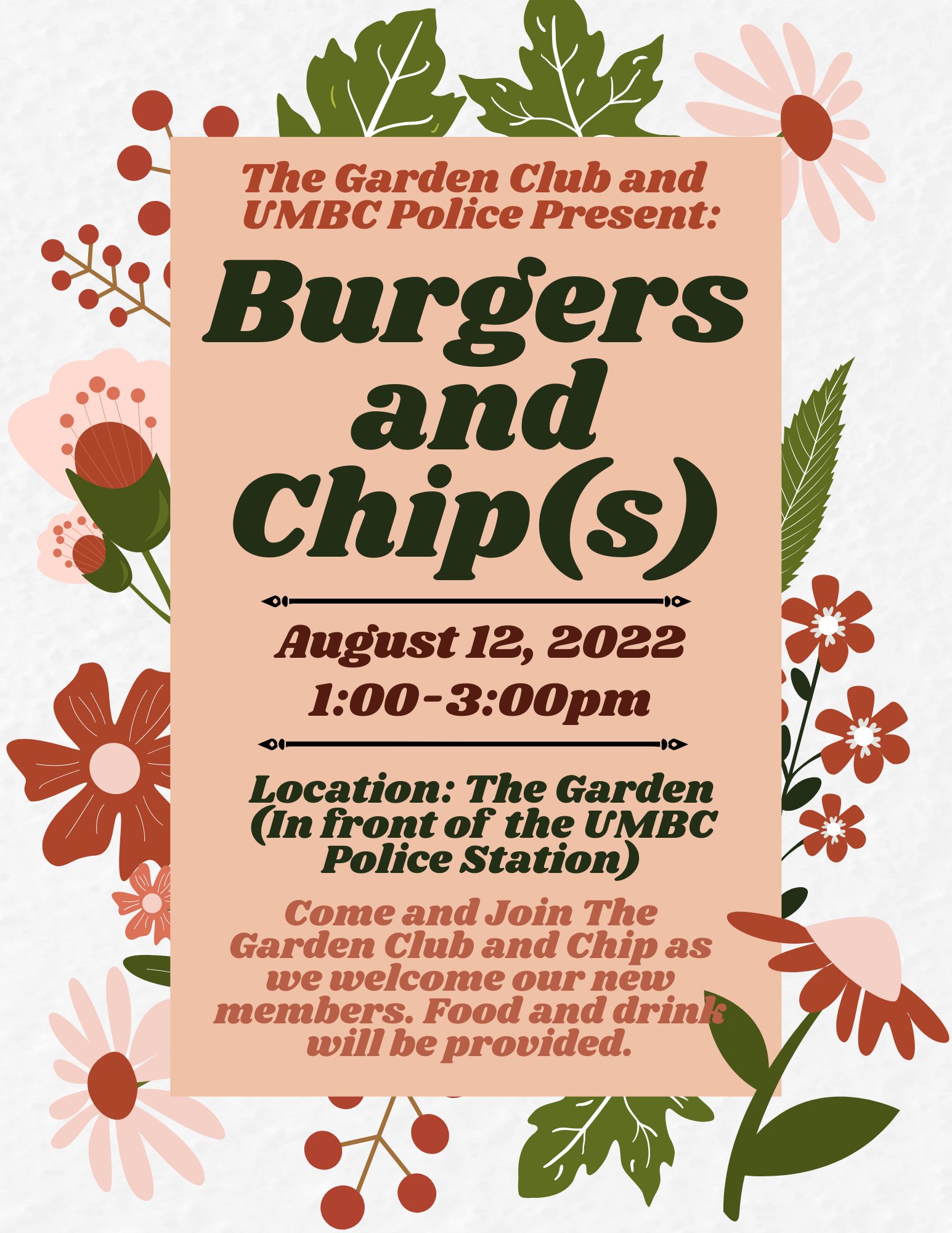 The Garden Club, with special guests Sgt. Cheatem and Chip, as well as the women's basketball team, are hosting our first event of the year! Burgers and Chip(s) will be happening on August 12th from 1-3pm at The Garden (located in front of the UMBC Police Station).