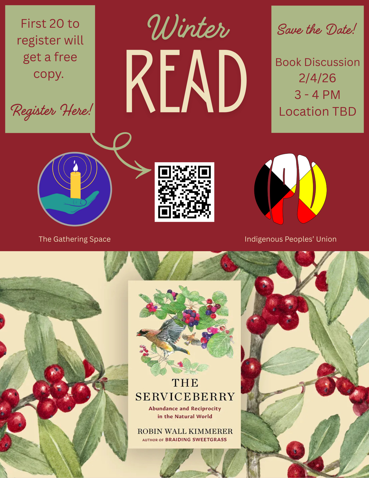 Join The Gathering Space and the Indigenous Peoples' Union in reading The Serviceberry by Robin Wall-Kimmerer over Winter Break!