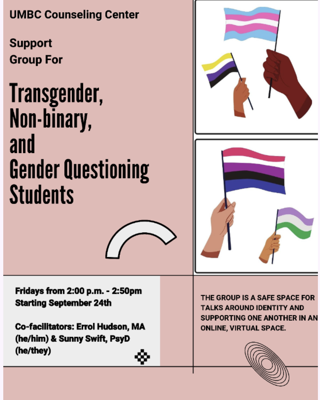 To join the group there is a pre-group screening process. For more information, email Errol (ehudson0@umbc.edu) and/or Sunny (eswift@umbc.edu)