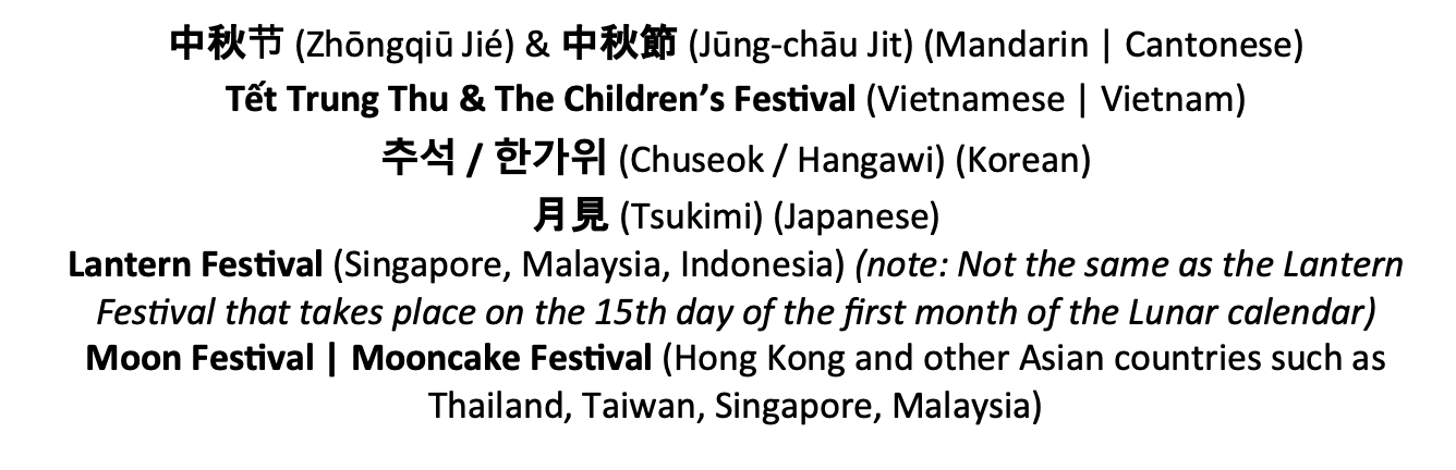 Each country has its own name or reference for the Mid Autumn Festival, here are some of them (for additional viewing, please see the attached photo):