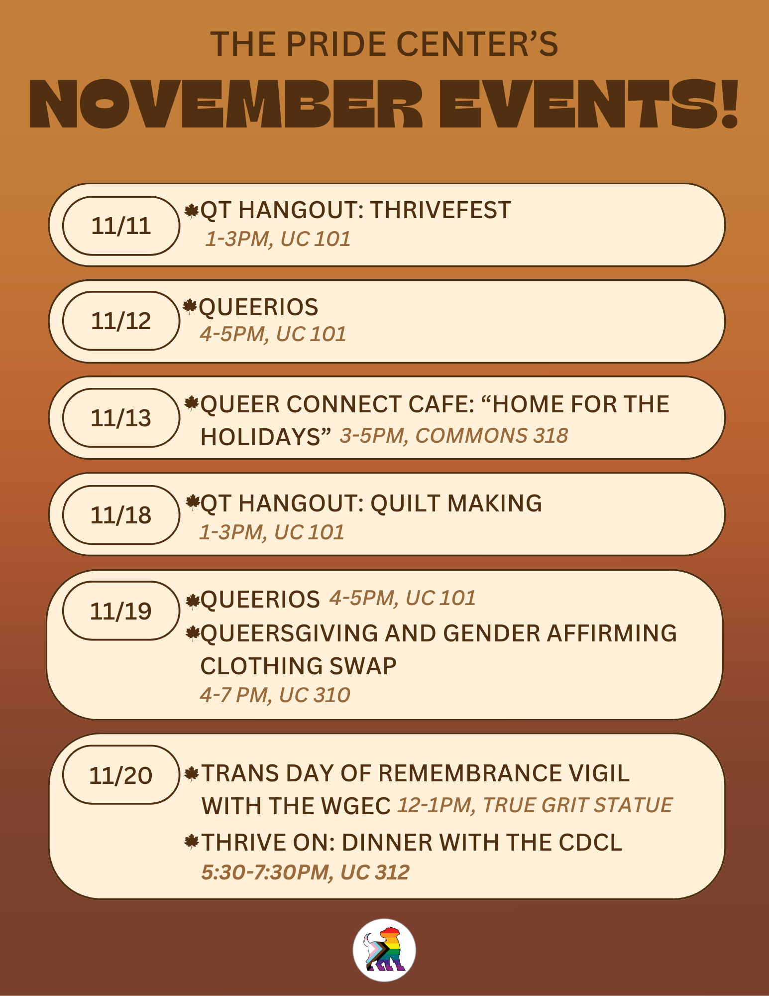 Take a look at our upcoming events this November! We hope you're just as excited as we are for a month of events with The Pride Center!