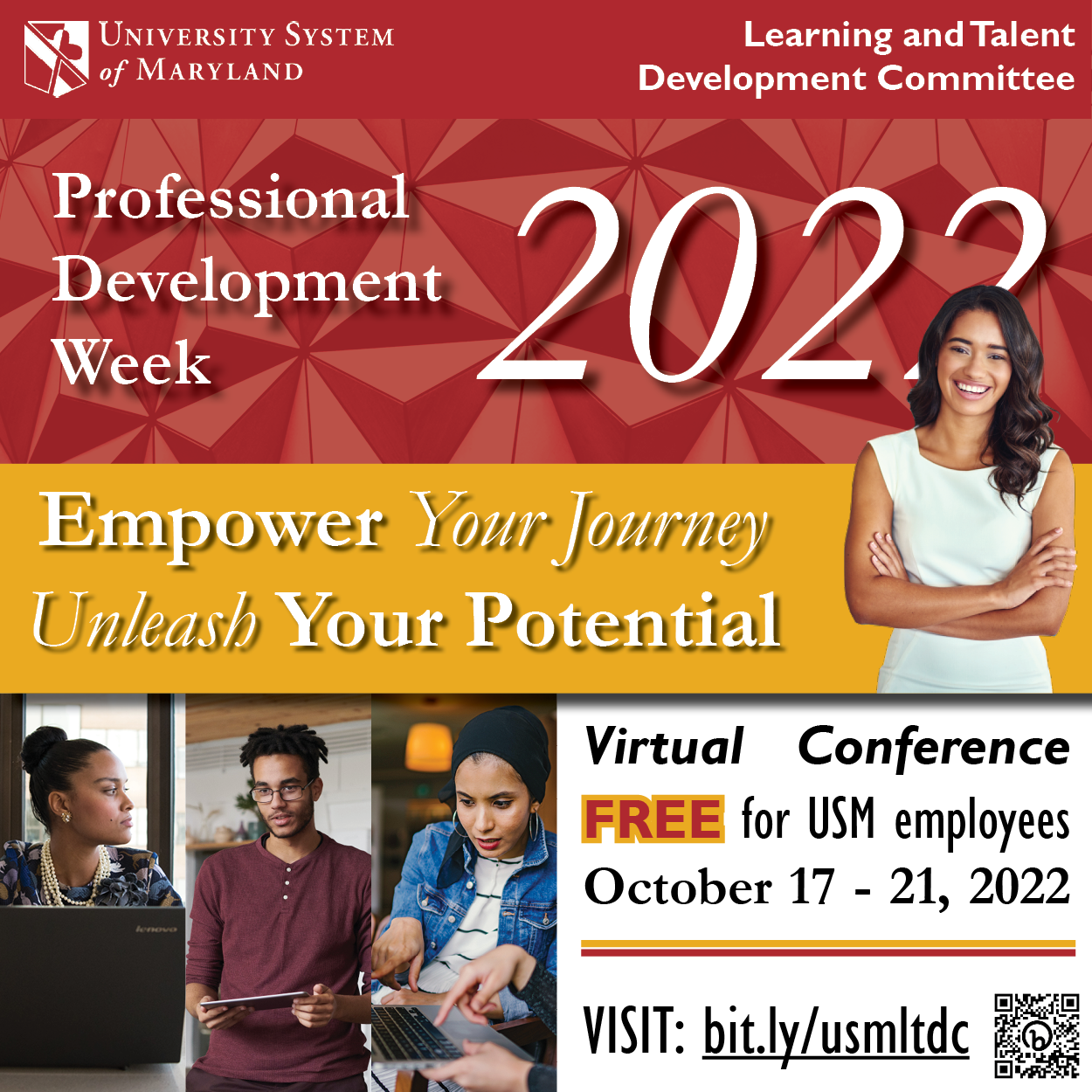 Are you ready to invest in your career in higher education? Whether you’re new and looking to forge your path, mid-career and looking to inject some energy, or staring down retirement and considering your legacy, there’s something for you at the USM Learning and Talent Development Committee's annual, virtual, week-long conference, USM Professional Development Week. Save the date for inspiring panels, engaging workshops, and networking with your colleagues from across the system. Empower Your Journey and Unleash Your Potential.