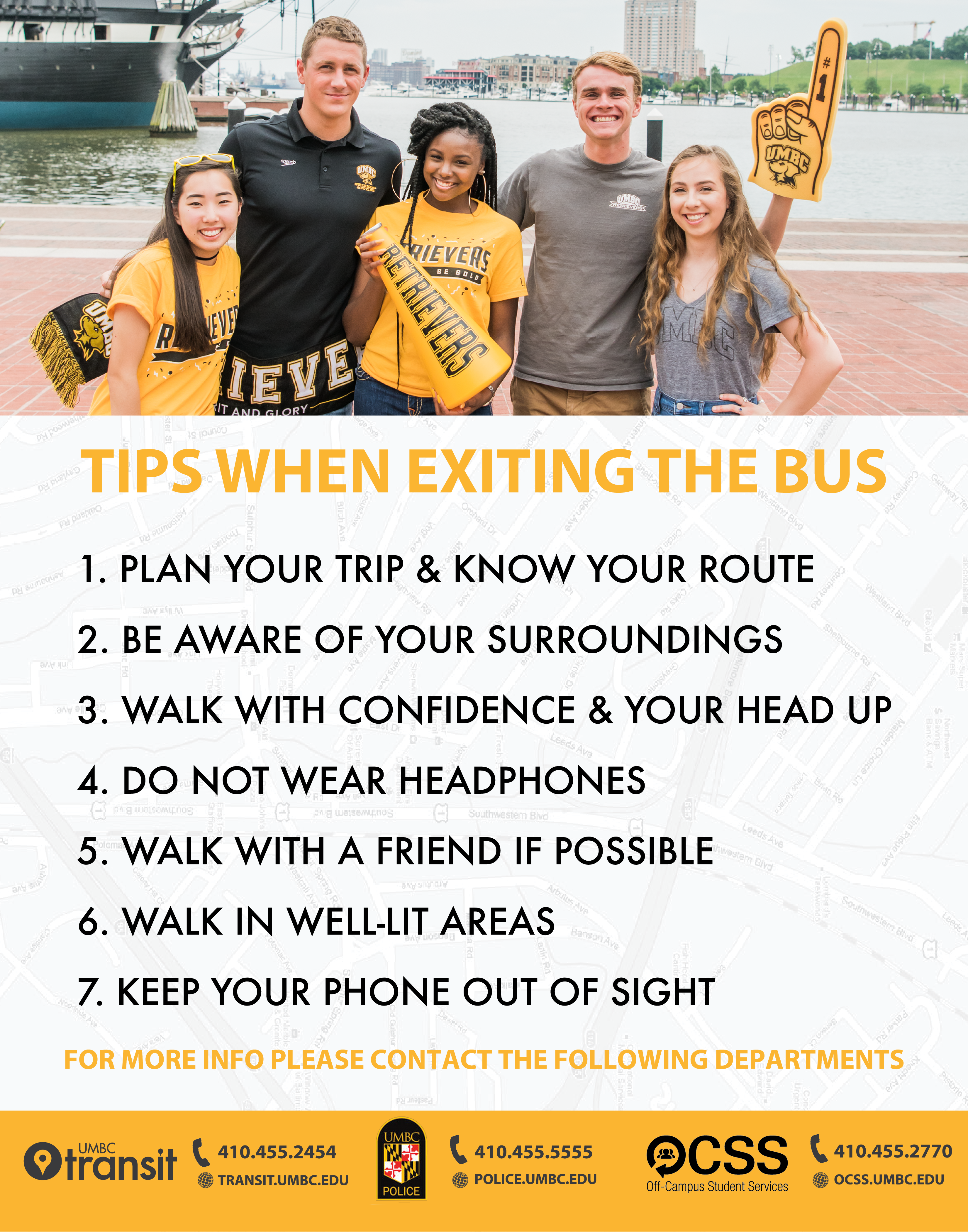 The UMBC police provides an escort service for anyone who feels unsafe when walking on or near campus. If you would like an escort please call 410-455-5555. If you observe suspicious activity or behavior, contact the police immediately by calling 410-455-5555.