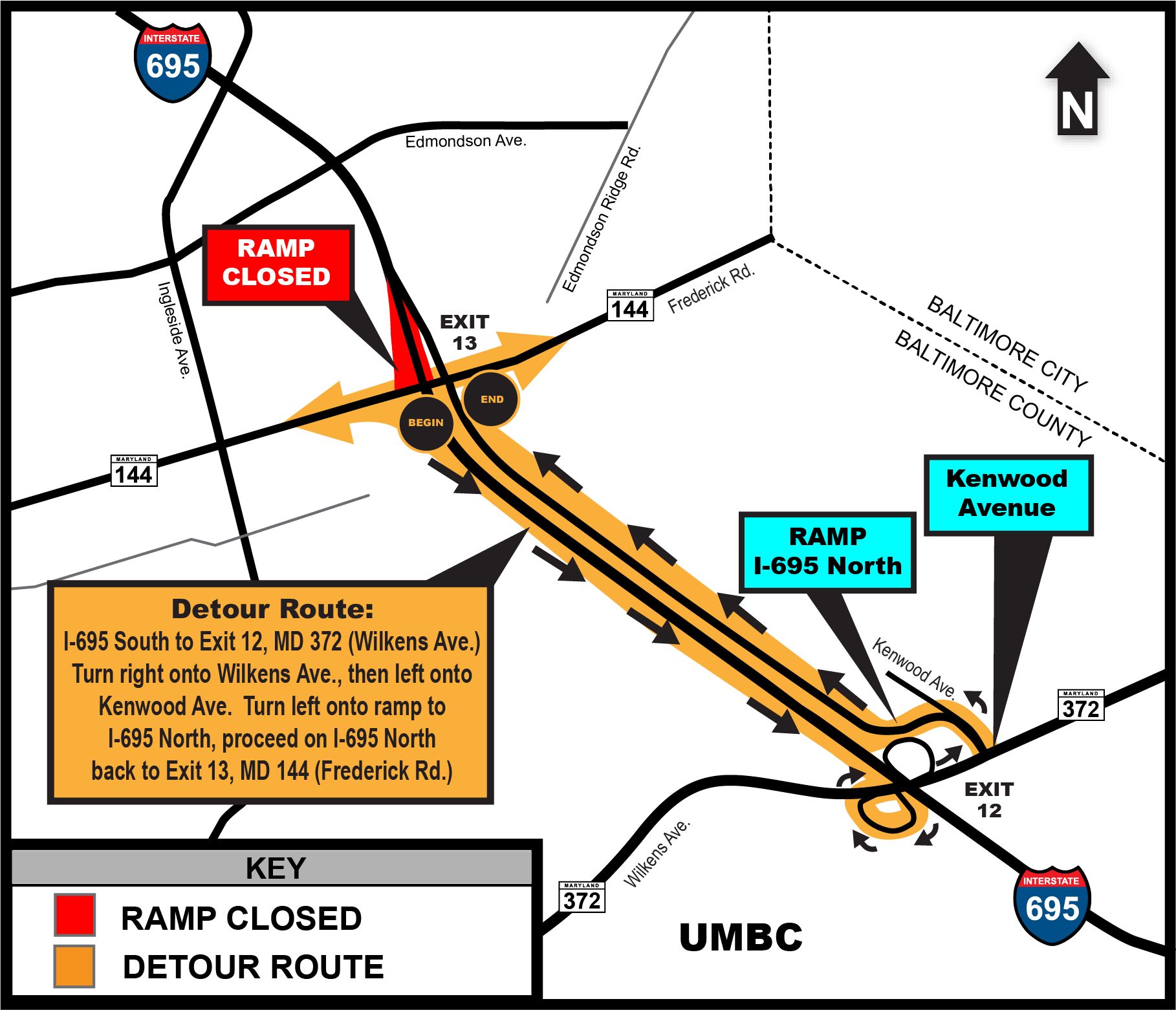 Motorists traveling from the outer loop/southbound I-695 to MD 144 will be detoured one mile south to the MD 372 (Wilkens Avenue) interchange. Motorists will use the ramp system to access the inner loop (northbound) I-695 back to the I-695/MD 144 interchange.