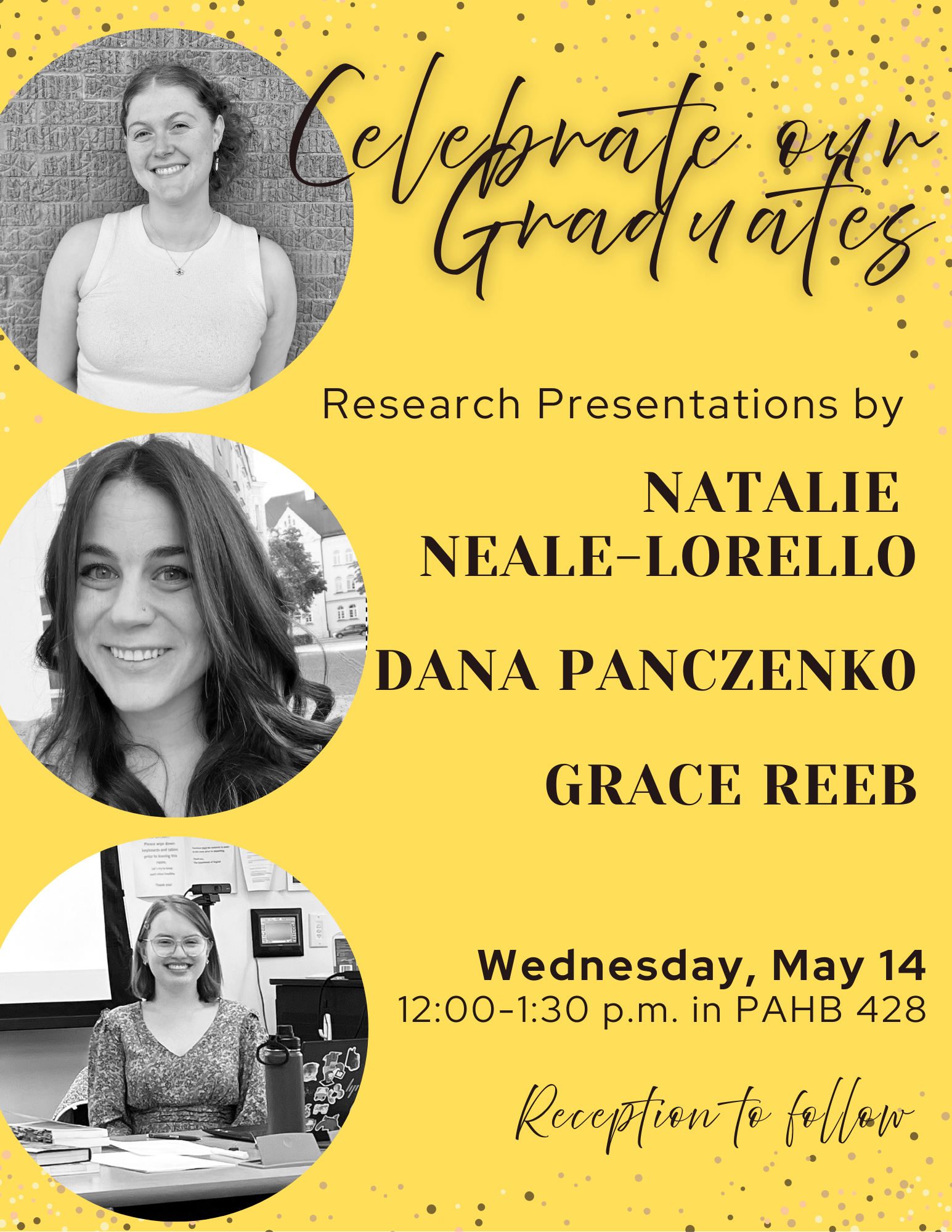 Please join us on May 14 from 12:00-1:30 in PAHB 428 for a celebration of our graduating Texts, Technologies, and Literature MA students!