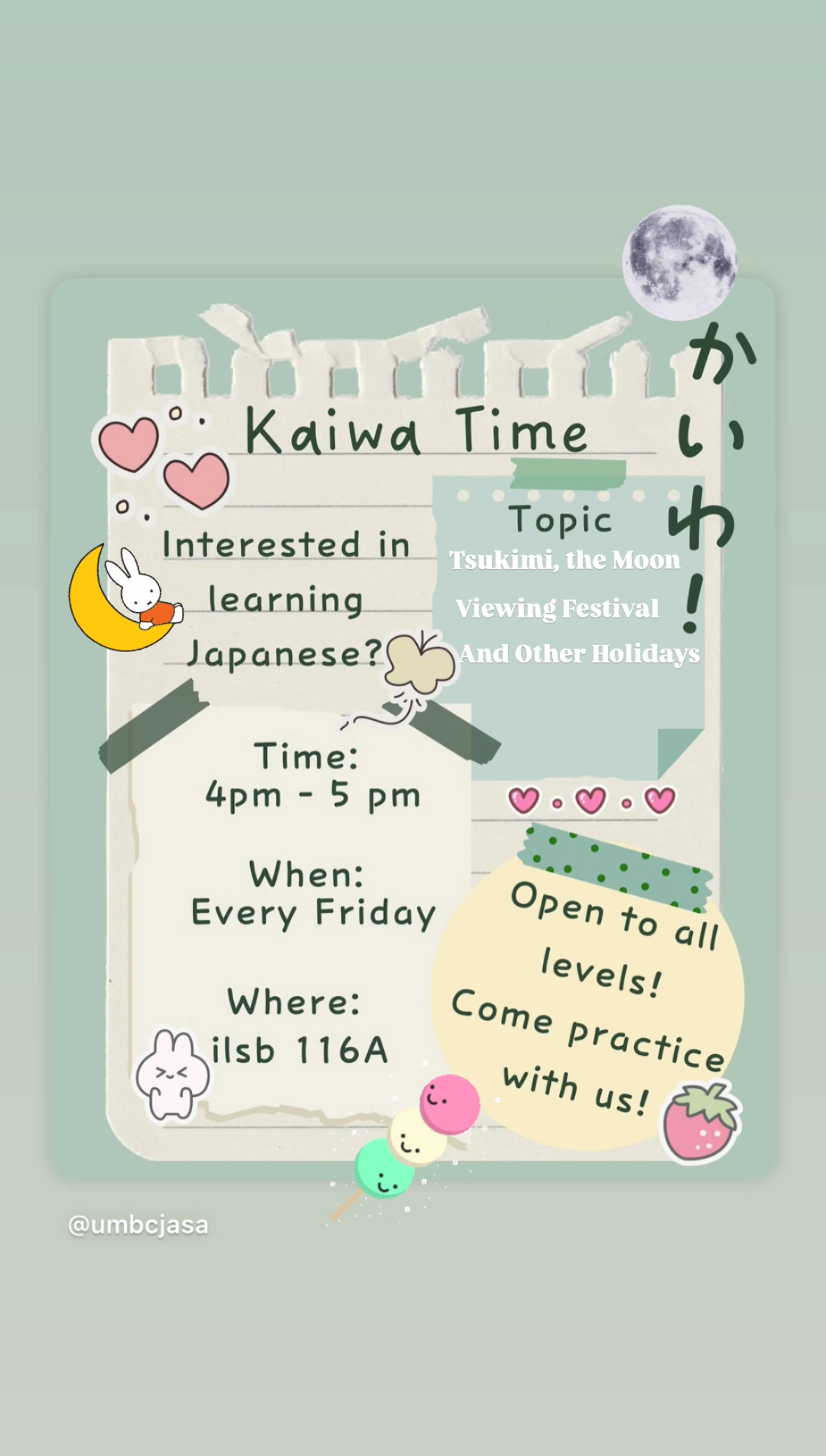 Hey everyone! Come join us for Kaiwa Time this Friday. We are going to be talking about the Moon Viewing Holiday, Tsukimi! We are going to be in ILSB 116A from 4-5pm!
