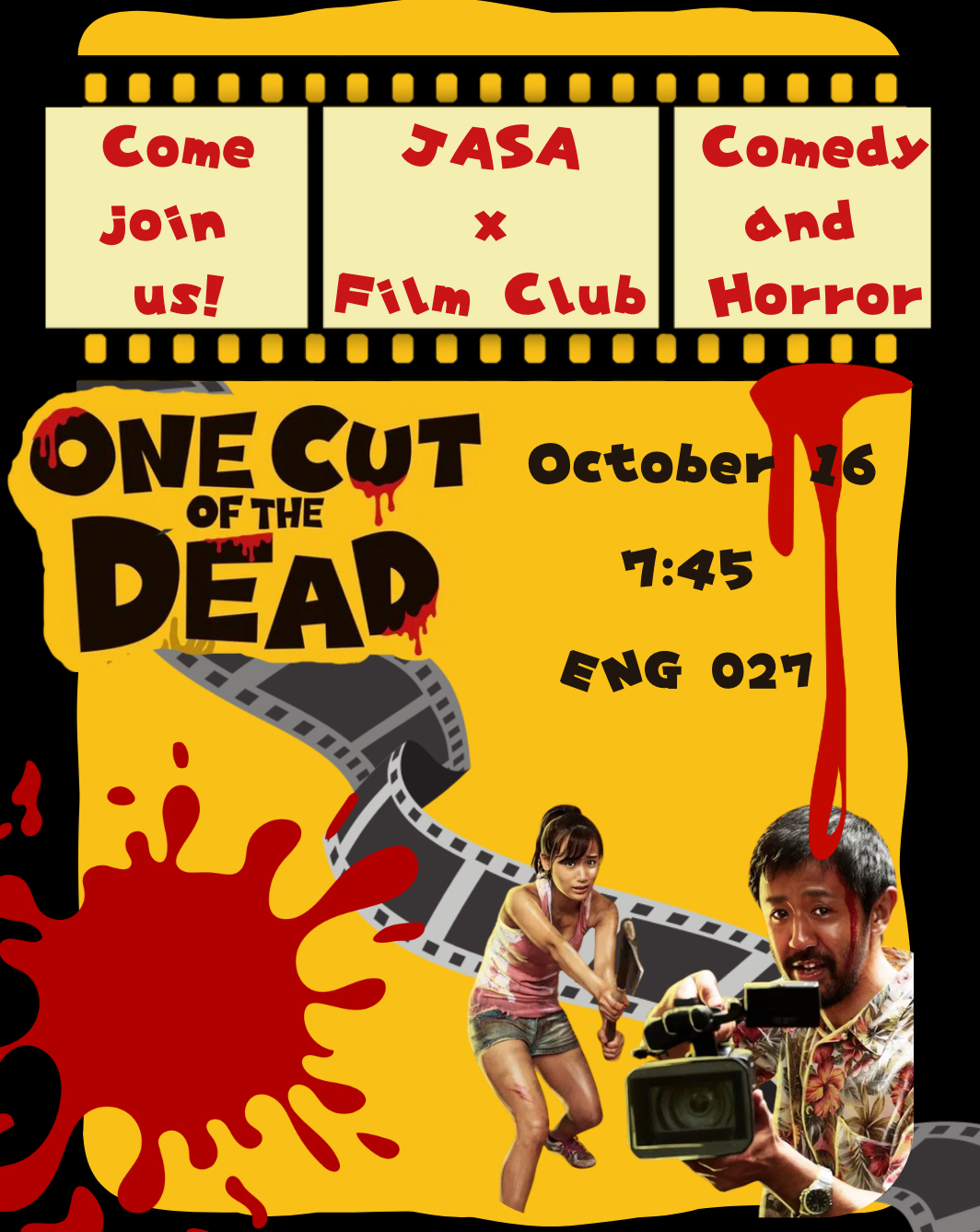 Hey everyone!! This week JASA will be having a collab with Film club and screening the movie One Cut of The Dead (2017)!! It's going to be this Thursday, October 16 in ENG 027. Come down and watch with us!!!