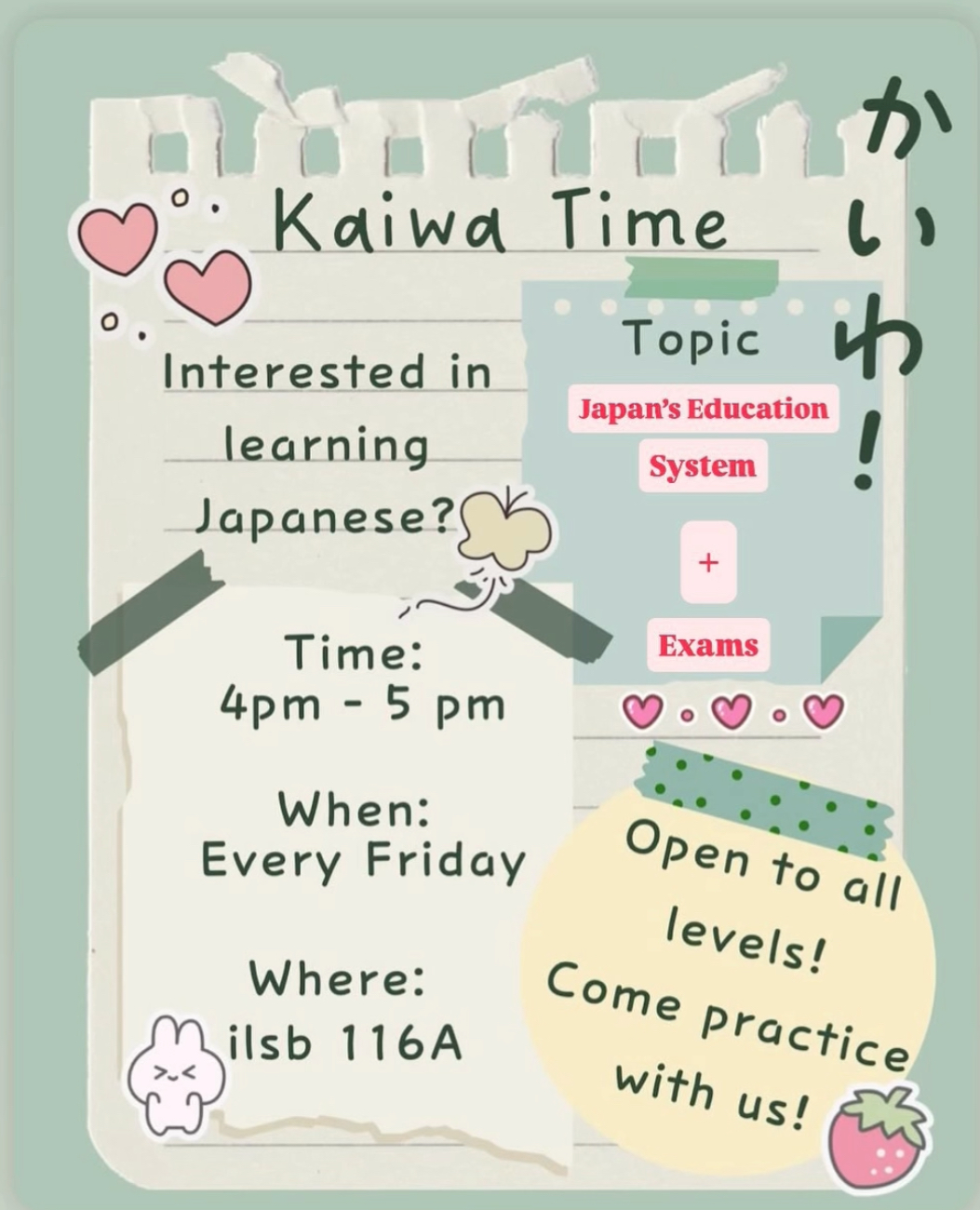Come join us for Kaiwa Time this Friday! We will be in ILSB 116A from 4-5pm and we will be talking about Japan's Education System and Exams