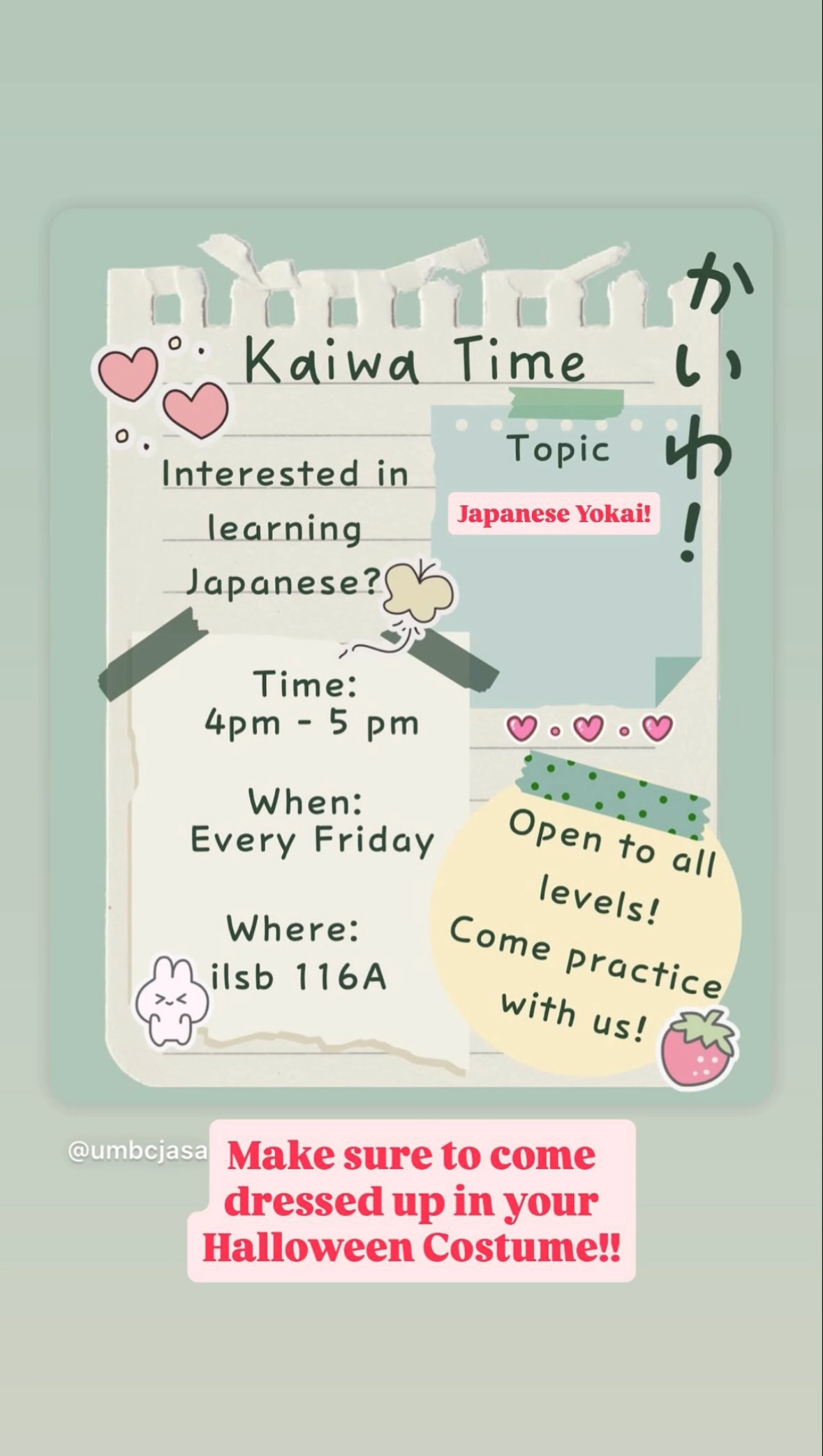 Come join us for Kaiwa time this Friday! Our topic is going to be about Japanese Yokai. We will be in room ILSB 116A from 4-5 pm. Come dressed in your Halloween Costume!!!