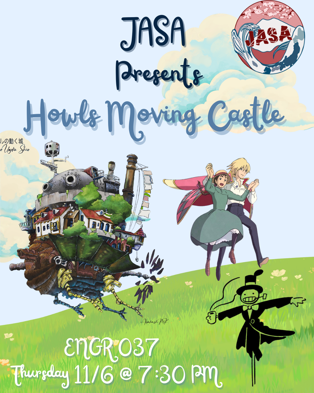 Looking to take a break from classes? Come to our Movie Night this Thursday and watch Howl's Moving Castle! We will be serving popcorn and also selling sakura cookies, matcha white choco cookies, and also checkerboard cookies! Make sure to stop by!