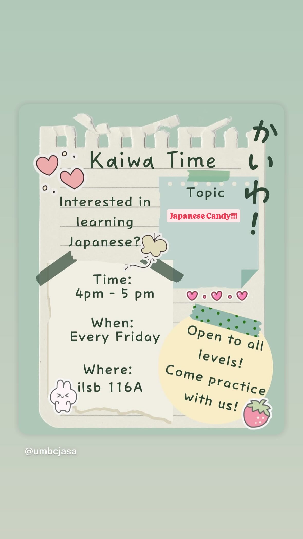 Come join us for Kaiwa Time Today! We will be talking about Top Japanese Candies! We will be in ILSB 116A from 4-5 pm