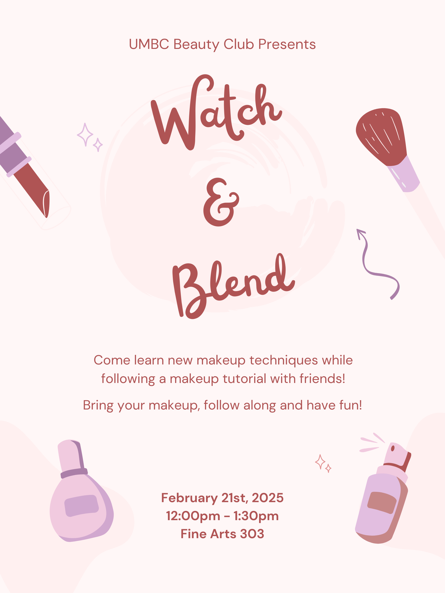 Join UMBC Beauty Club for Watch & Blend! This event is all about learning new makeup techniques while following a fun tutorial with friends. Bring your favorite beauty products, blend to perfection, and enjoy a glam-filled session with us!