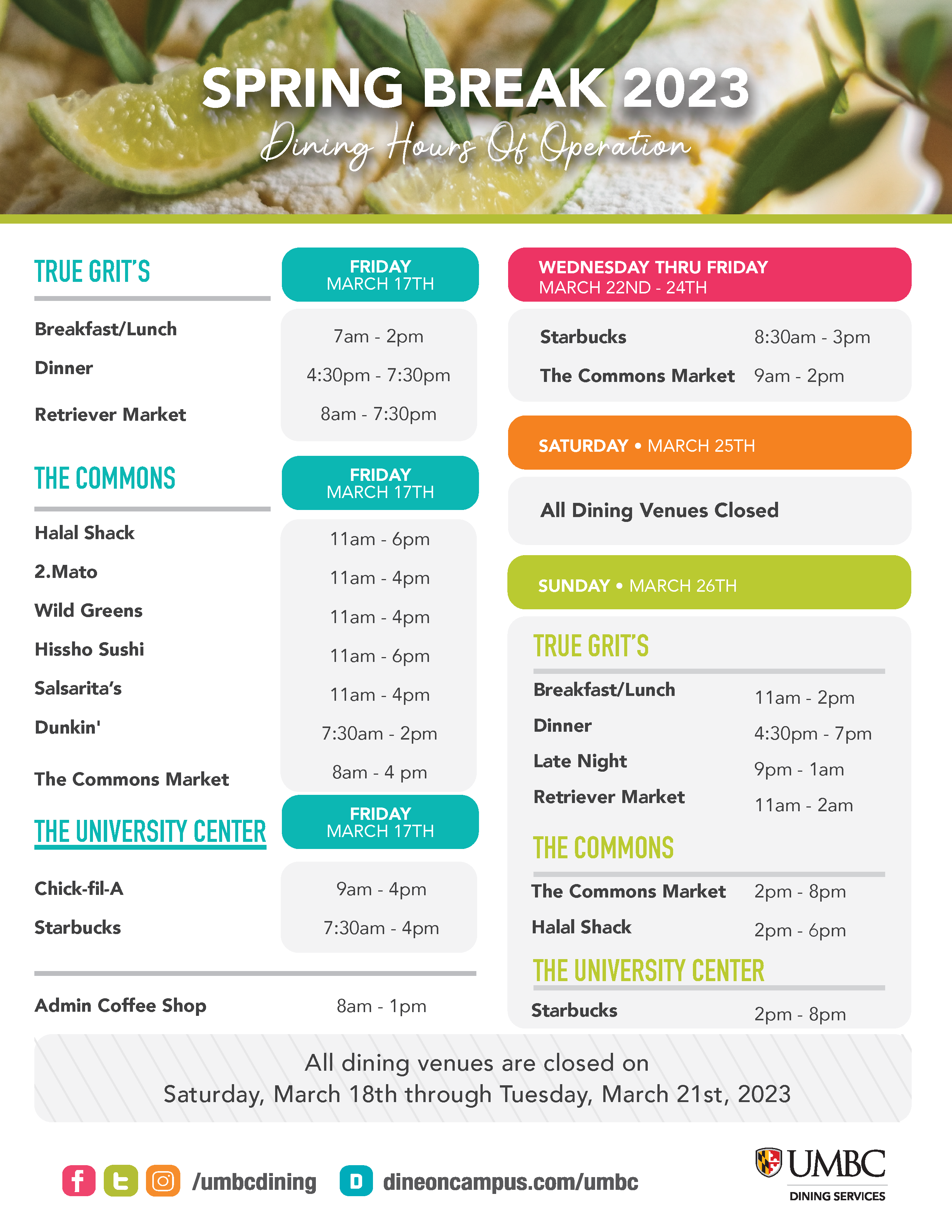 Please find our Spring Break hours attached. True Grit's will close at 7:30 pm on Friday, March 17th and will re-open at 11 am on Sunday, March 26th. A few retail locations will be open over spring break.